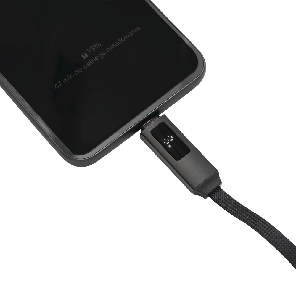 Charging and data transfer cable to charge smartphones and USB-powered devices (60W power delivery), USB Type-C to USB Type-C, LED power indicator, magnetic closure, with keyring. Dimensions: 16 x 1,4 x 0,6 cm