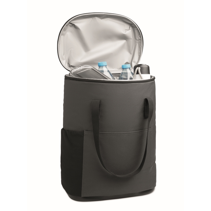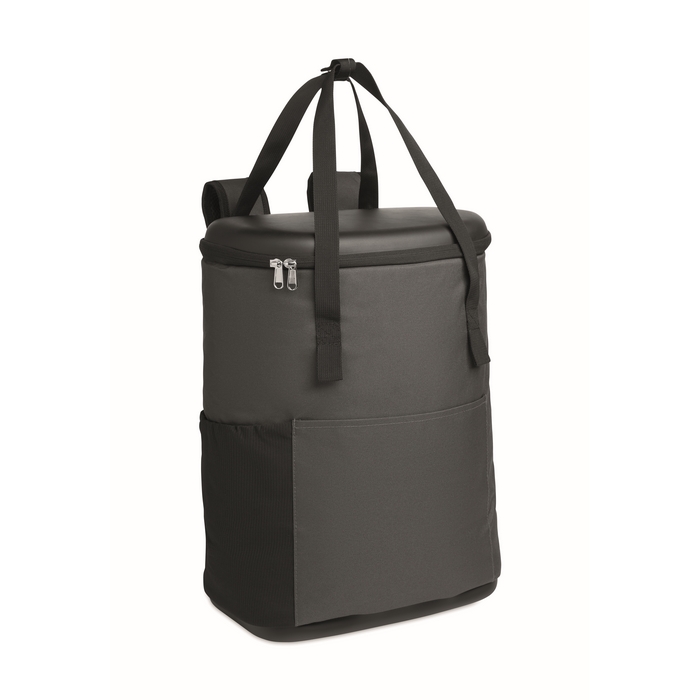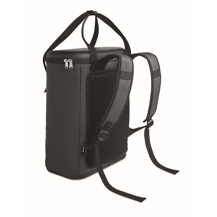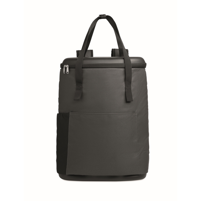 Cooler rucksack made of water-repellent 600D RPET with PE foam insulation and PEVA lining. Features moulded lid, padded mesh back, front zip pocket, and side sandwich mesh pockets. Capacity 20L. Dimensions: 33 x 20 x 46 cm