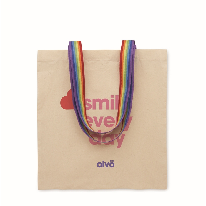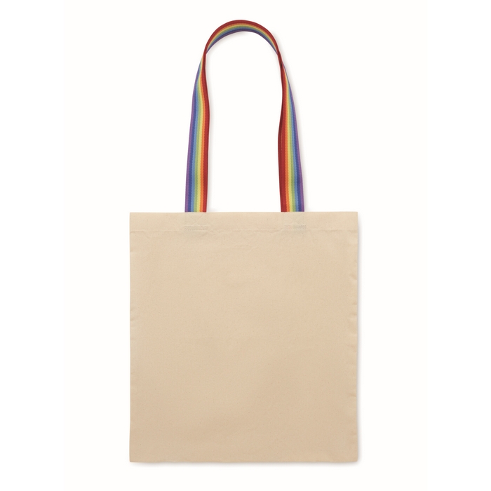 180 gr/m2. cotton shopping bag with rainbow colour handles. Carry weight limit 2.5kgs. Rozměry: 38 x 42 cm