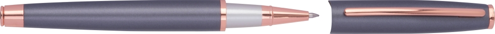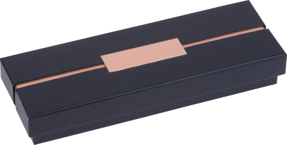 CrisMa metal writing set consisting of a twist ballpoint pen (800 m writing length) and a rollerball pen (500 m writing length) made of metal with rosegold-colored details. Both pens write in blue and come packaged in a black cardboard box. Dimensions: 18 x 6,2 x 2,8 cm