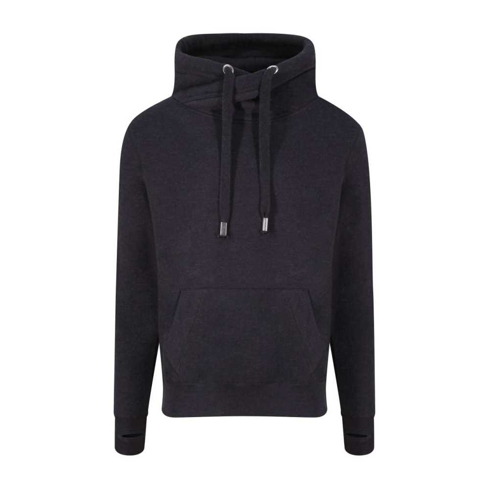 Unisex hooded sweatshirt with crossover neck, 3-piece double fabric hood, flat lace-up drawstrings, thumbhole cuffs, kangaroo pocket, brushed fleece interior, ribbed cuffs and hem, double needle stitching detail. Tear-off label. Material 70% ring-spun cotton + 30% polyester.
