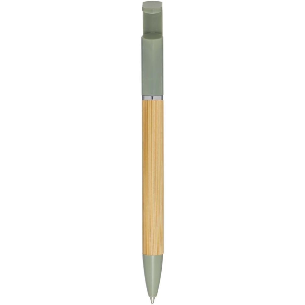 Bamboo ballpoint pen that also functions as a phone holder. The button and mid ring are made of recycled plastic, the tip is made of brass, and the barrel is made of responsibly sourced bamboo. Ink colour: Blue. Writing length: 1000 metres. Nib size: 1.0 mm. Dimensions: 14,7 x O 1 cm