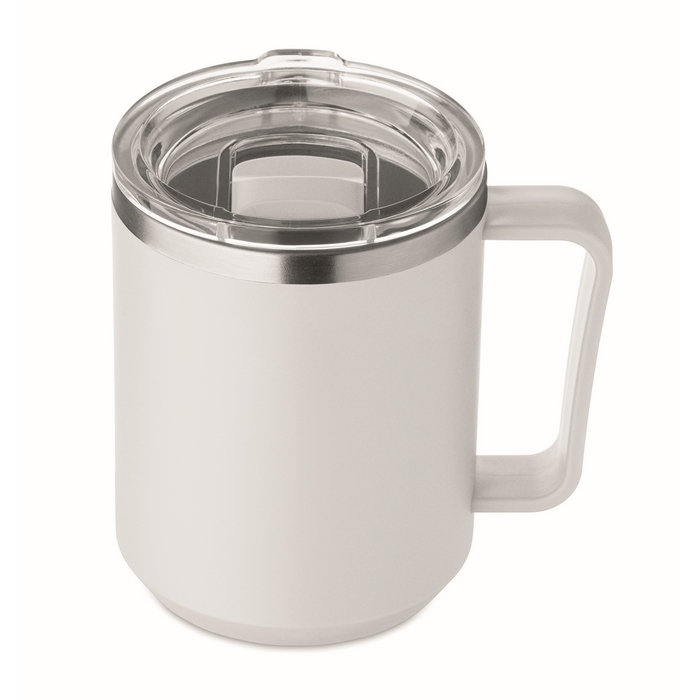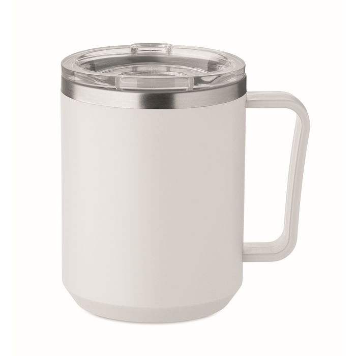 Double wall mug with 90 % recycled stainless steel and 10% stainless steel interior and recycled PP exterior. Includes transparent AS sliding lid. Capacity 400ml. Rozměry: 11.6 x 11.5 cm