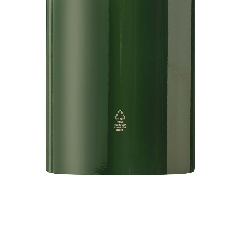 Drinking bottle, single-walled: made of recycled stainless steel, secure black screw cap made of plastic, silicone sealing ring, carrying handle, key ring and carabiner (the carabiner is NOT suitable for climbing), capacity approx. 400 ml. Dimensions: O7,2 x 19 cm