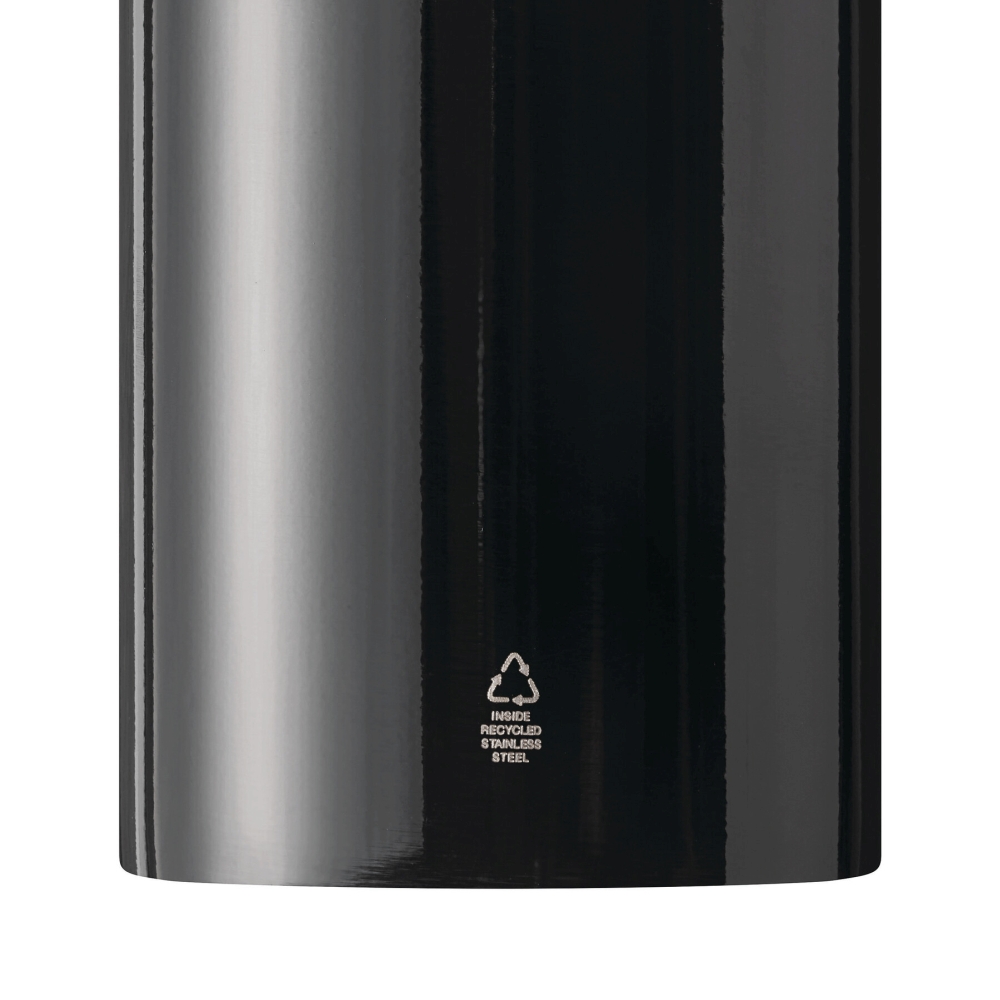 Drinking bottle, single-walled: made of recycled stainless steel, secure black screw cap made of plastic, silicone sealing ring, carrying handle, key ring and carabiner (the carabiner is NOT suitable for climbing), capacity approx. 750 ml. Dimensions: O7,3 x 26 cm