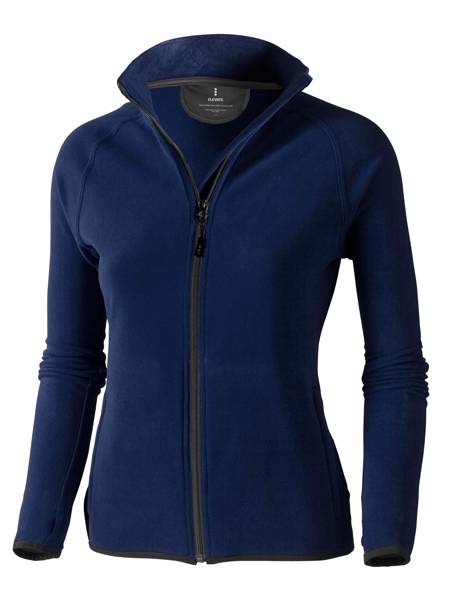 Brossard ladies micro fleece jacket. Hand pockets with zippers. Elastic binding at the cuffs and the bottom of jacket. Thumb holes. Raglan sleeves. Insulating . Satin neck tape. Light weight fleece jacket. Inner stormflap with chinguard. Contrast coloured bartacks at pocket. 100% Polyester micro fleece, 2 sides brushed, 1 side antipilling. 190gsm