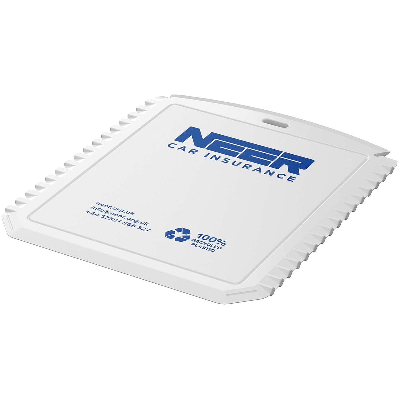 Compact and convenient, the Thrym rectangular recycled plastic ice scraper is the perfect tool for use in icy conditions. Made from 100% recycled plastic, its durable construction ensures effective removal of ice and frost. Features a flat edge, a serrated edge, and a windscreen wiper blade cleaner. Recycled HIPS Plastic. Dimensions: 12 x 10 cm