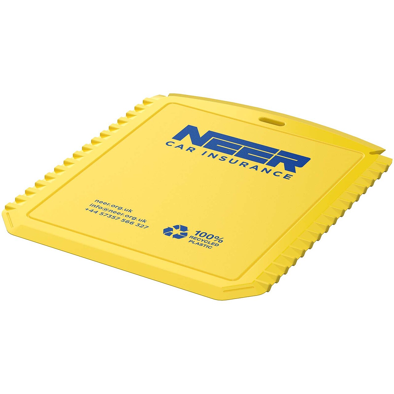 Compact and convenient, the Thrym rectangular recycled plastic ice scraper is the perfect tool for use in icy conditions. Made from 100% recycled plastic, its durable construction ensures effective removal of ice and frost. Features a flat edge, a serrated edge, and a windscreen wiper blade cleaner. Recycled HIPS Plastic. Dimensions: 12 x 10 cm