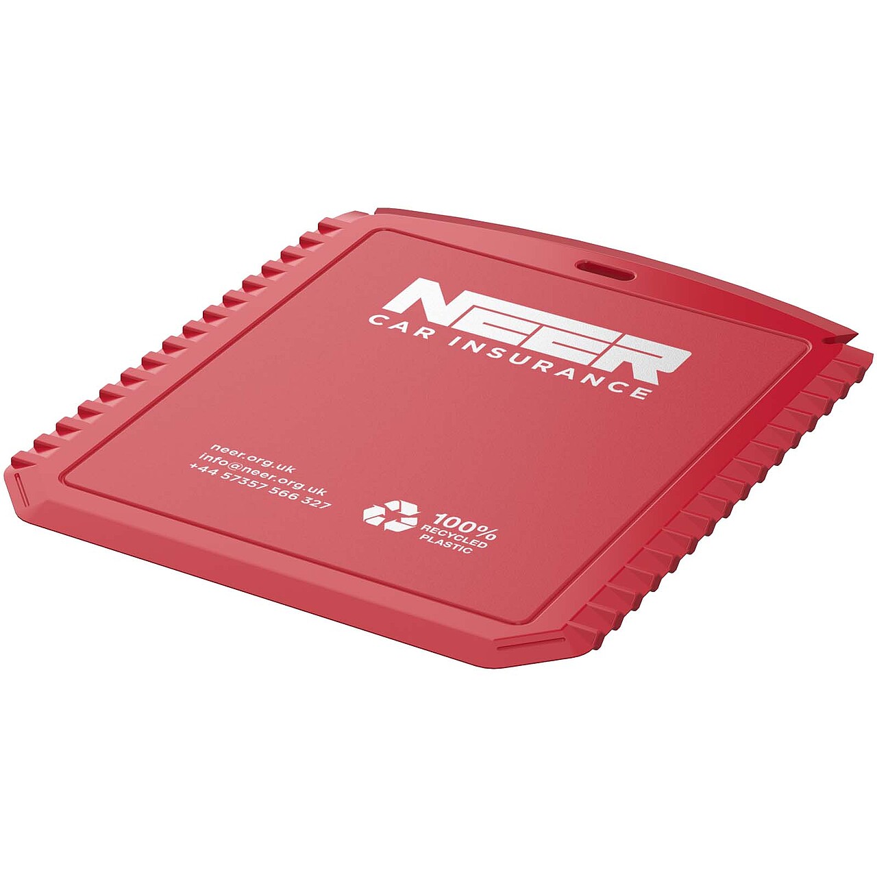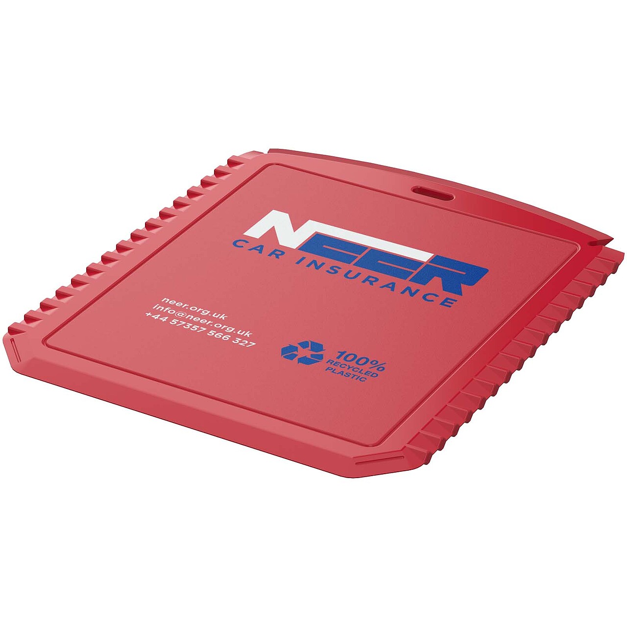 Compact and convenient, the Thrym rectangular recycled plastic ice scraper is the perfect tool for use in icy conditions. Made from 100% recycled plastic, its durable construction ensures effective removal of ice and frost. Features a flat edge, a serrated edge, and a windscreen wiper blade cleaner. Recycled HIPS Plastic. Dimensions: 12 x 10 cm