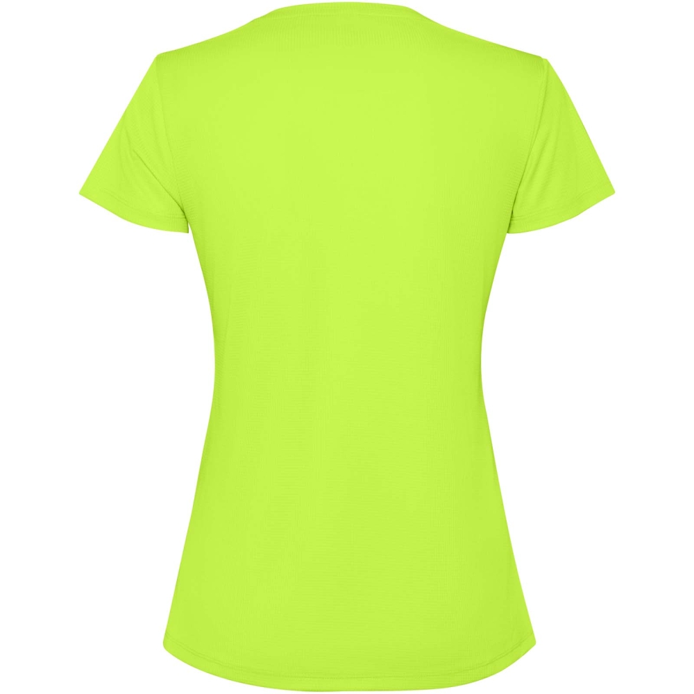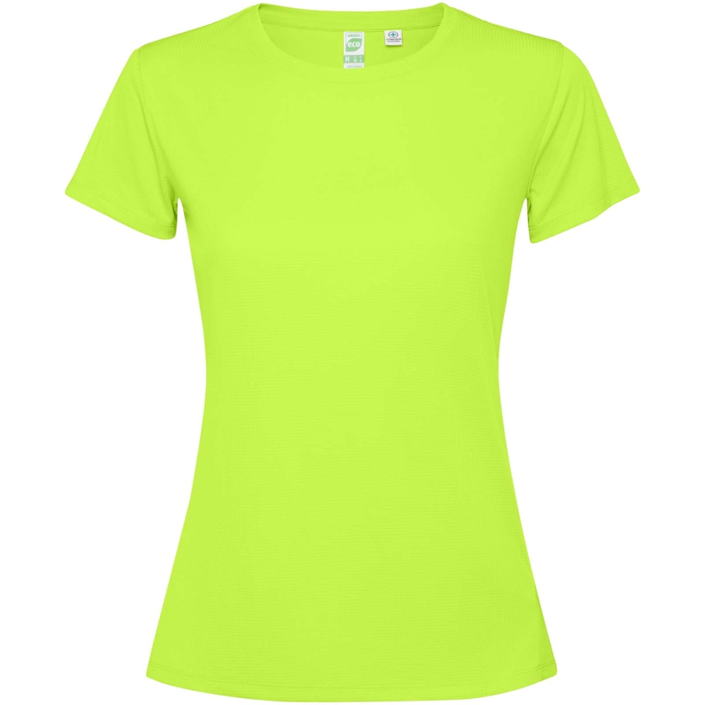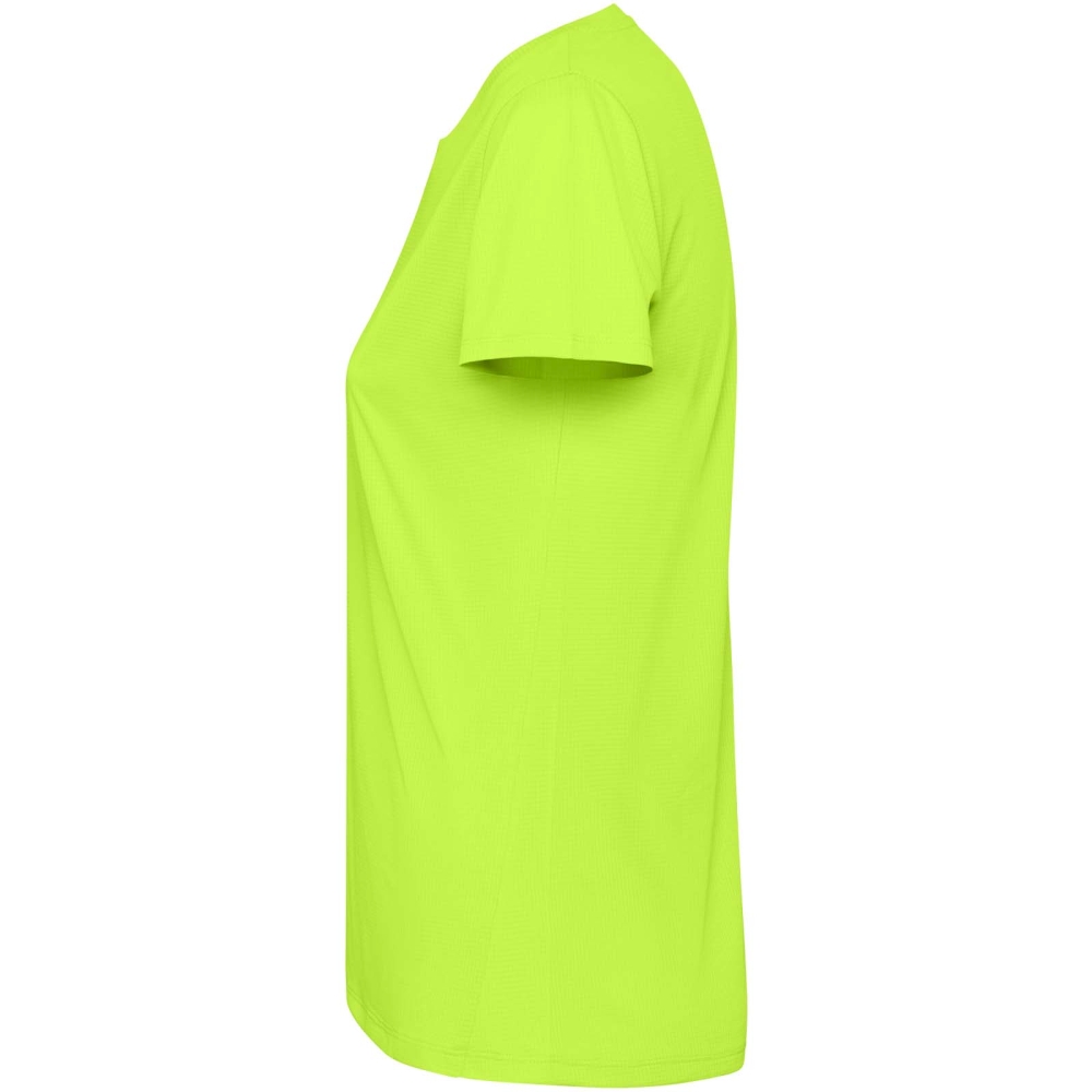 Short-sleeved fitted technical t-shirt for women. Collar with matching seams. Back hem slightly longer than the front. Side seams shifted forward.