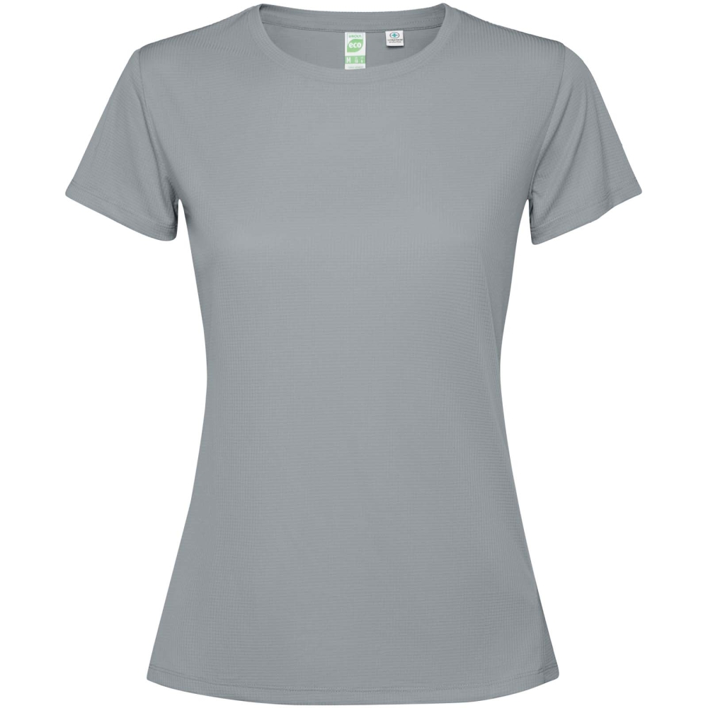 Short-sleeved fitted technical t-shirt for women. Collar with matching seams. Back hem slightly longer than the front. Side seams shifted forward.