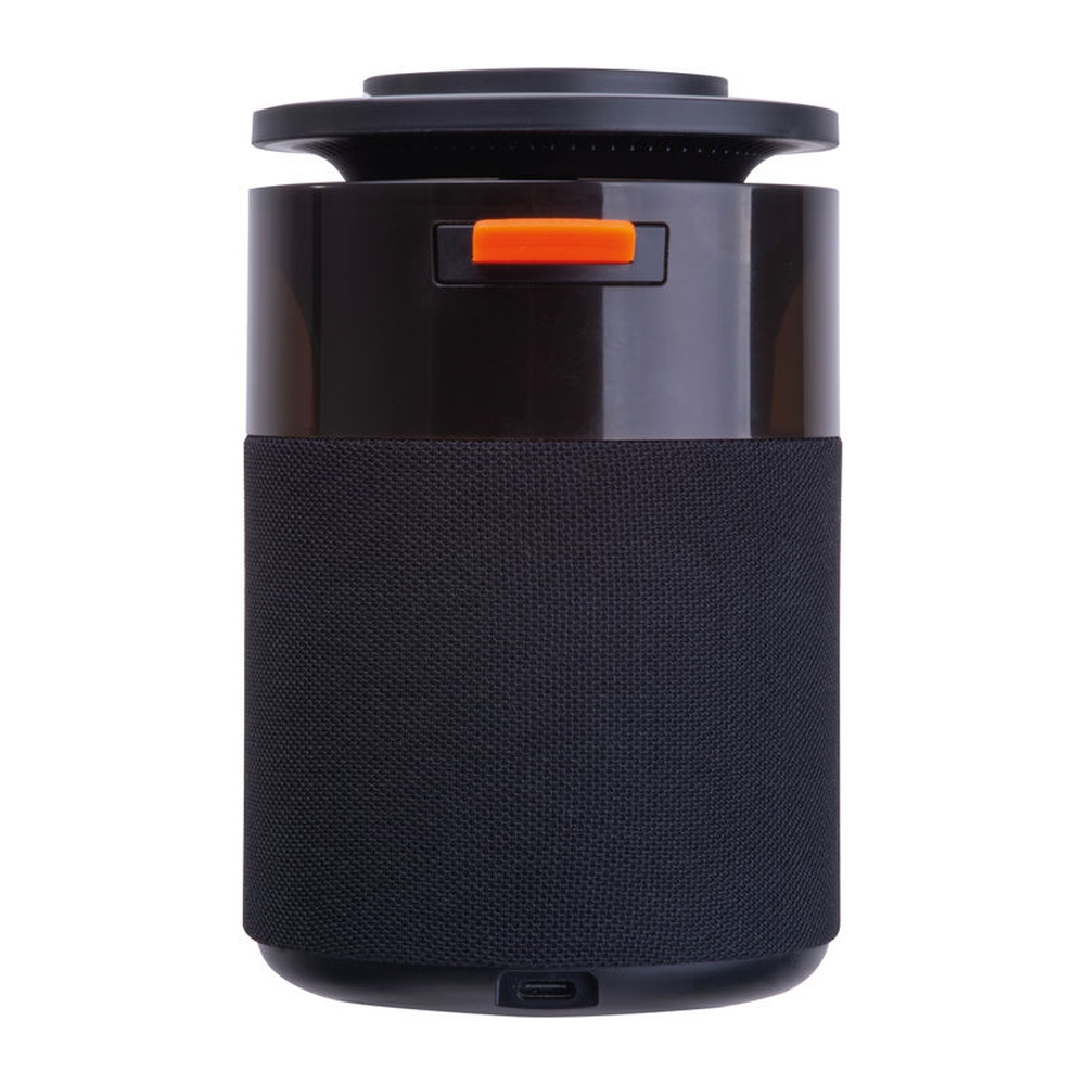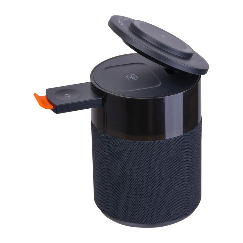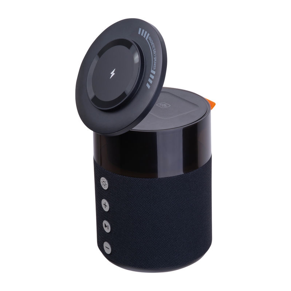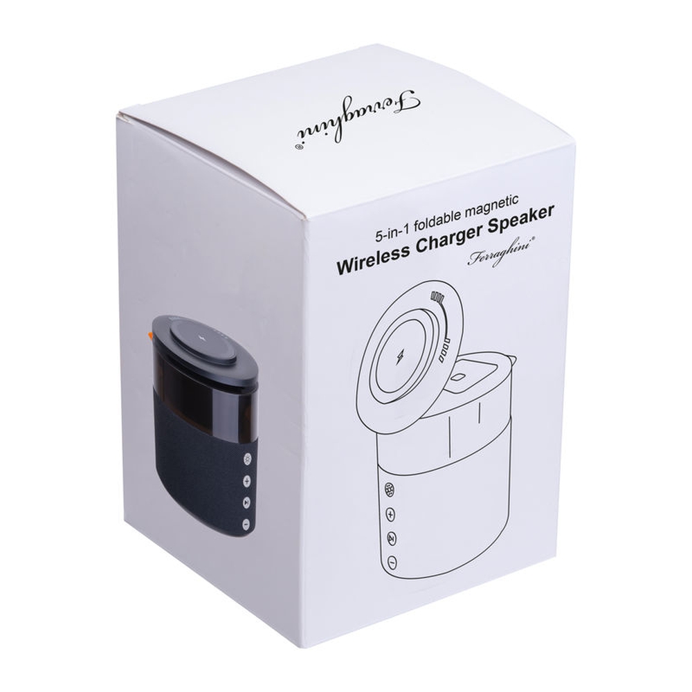 5-in-1 5W Bluetooth 5.4 speaker from Ferraghini with integrated wireless charger for a smartphones, AirPods, and Apple Watches, comes with a USB-C cable. 1800 mAh battery, runnig time 4-6 hours. Features LED sleep light. Dimensions: o 9,4 x 14,5 cm