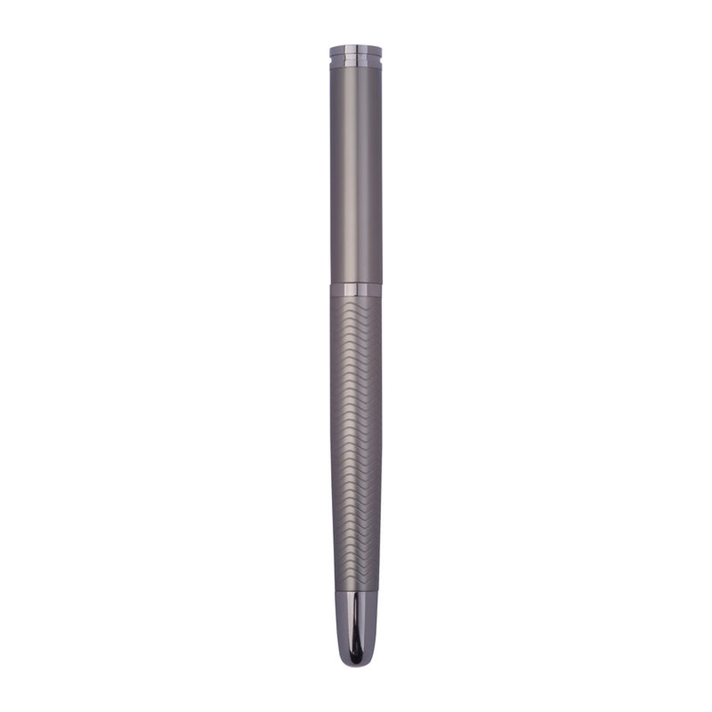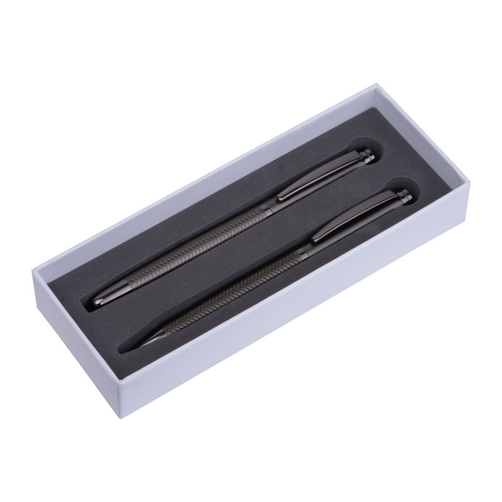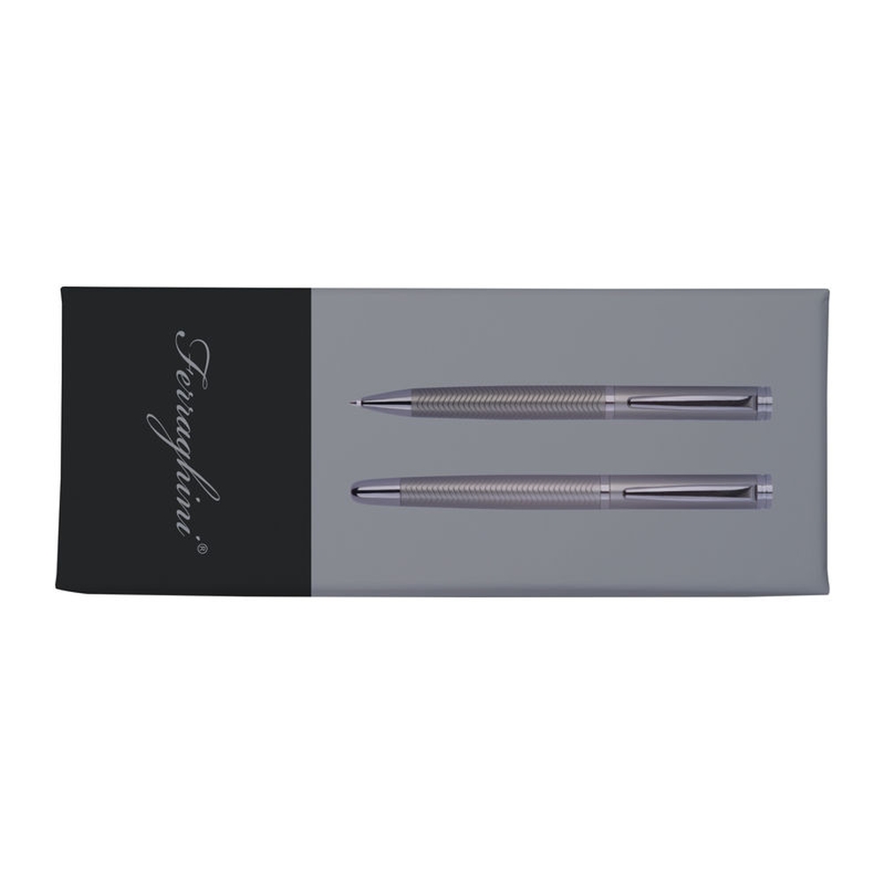 Ferraghini writing set consisting of a twist ballpoint pen with blue ink refill (600 m writing length) and a fountain pen (including blue cartridge) made of stainless steel. Dimensions: 17,5 x 7 x 3 cm