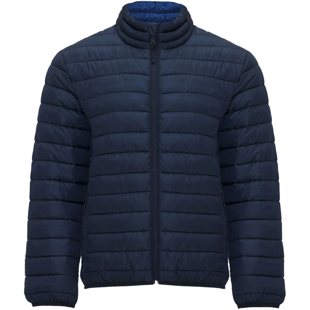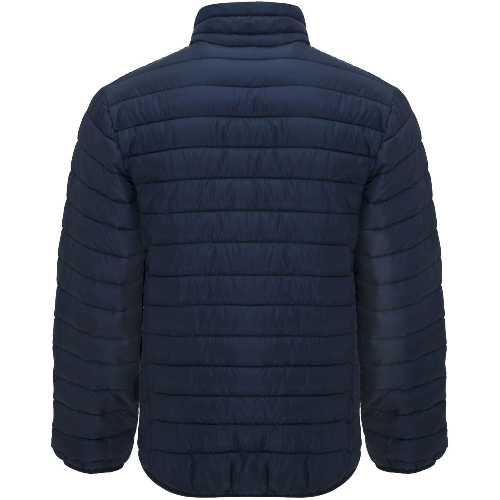 Mens quilted jacket with feather touch padding. Inverted zippers with matching chin protector and puller. Two front pockets with zippers. Matching elastic edging in collar, cuffs and hem. Contrasting inner lining. Includes stow carry bag. Lightweight and foldable garment. Removable label. Water resistant. Wind-proof. The model is 184 cm and is wearing size L.