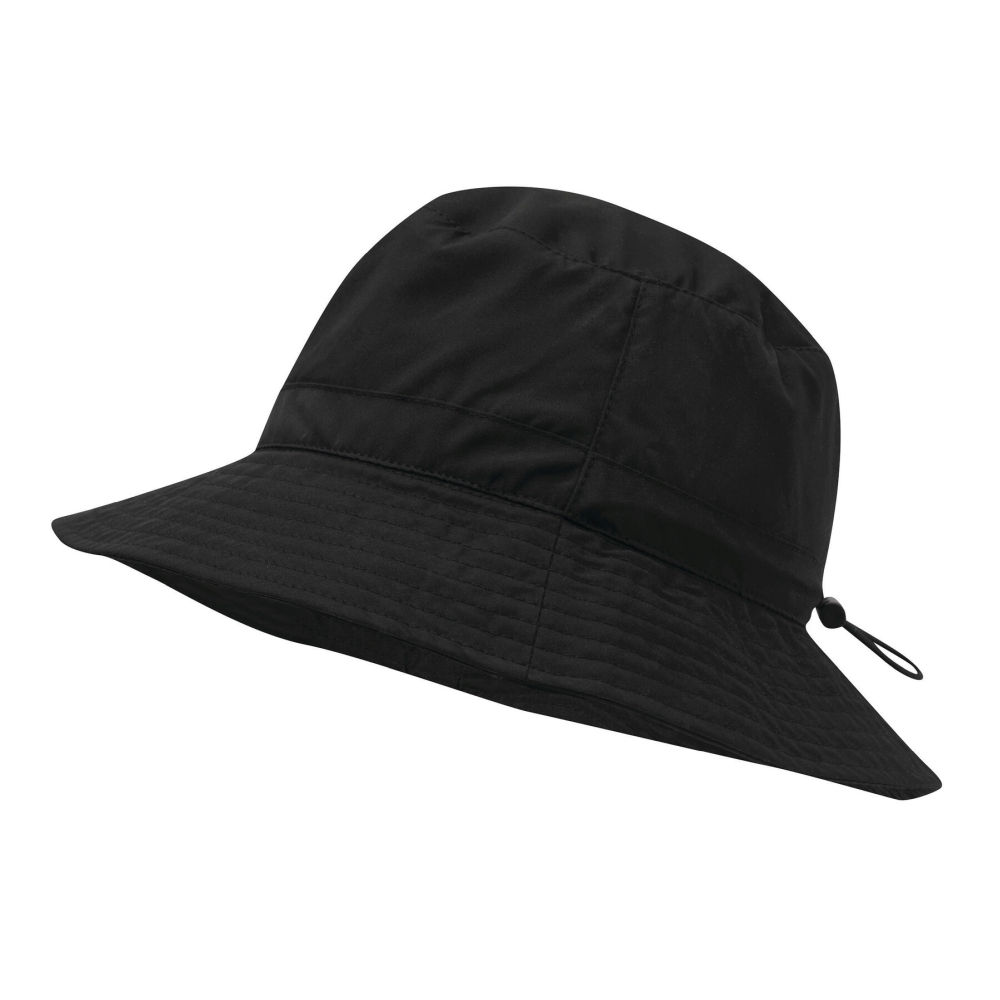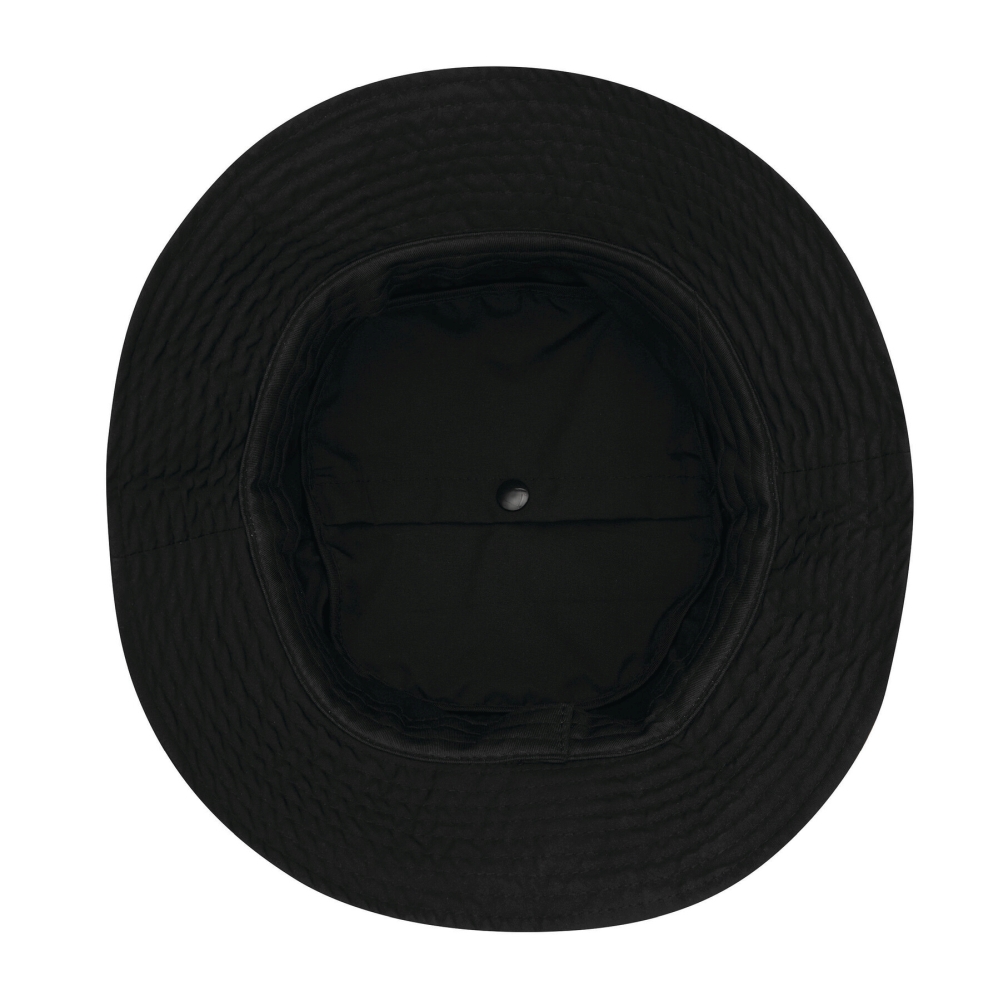 Foldable bucket hat: water-repellent, drawstring with plastic stopper to adjust to head circumference, can be converted into a pouch using a snap button, with carabiner hook (the carabiner is NOT suitable for climbing).