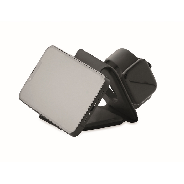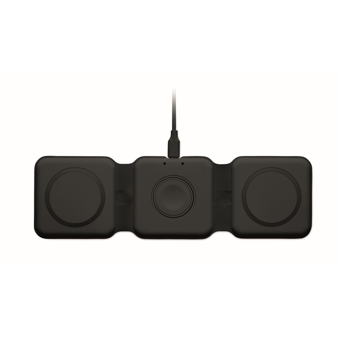 3 in 1 foldable charging station in ABS. It has 3 wireless charging spots (15W). Input: 2-in-1 Type-C and Type-A. Dimensions: 25 x 7.5 x 0.8 cm