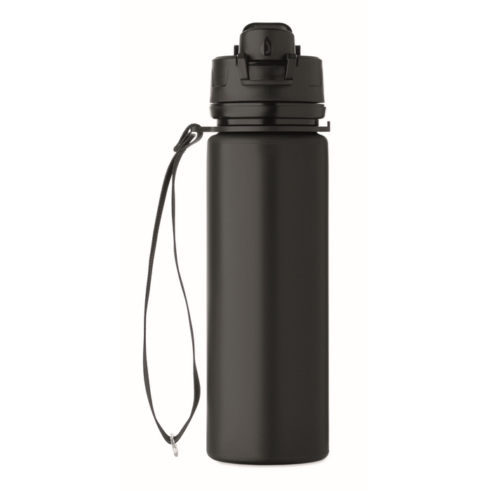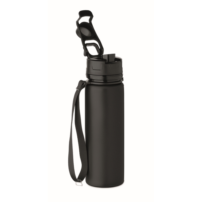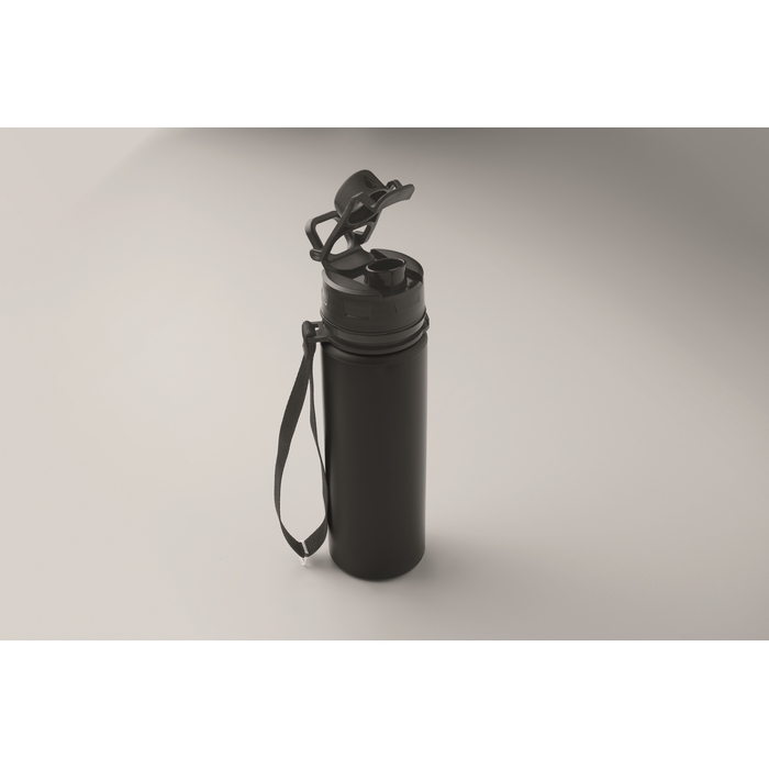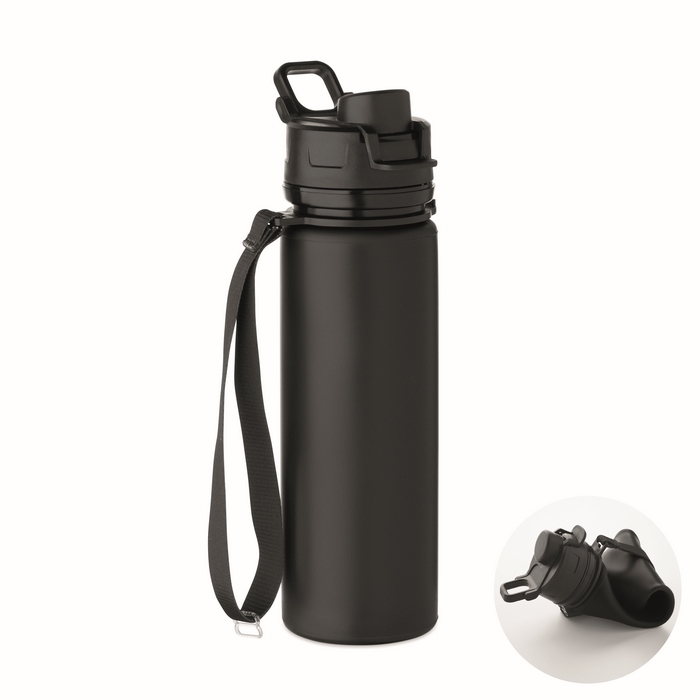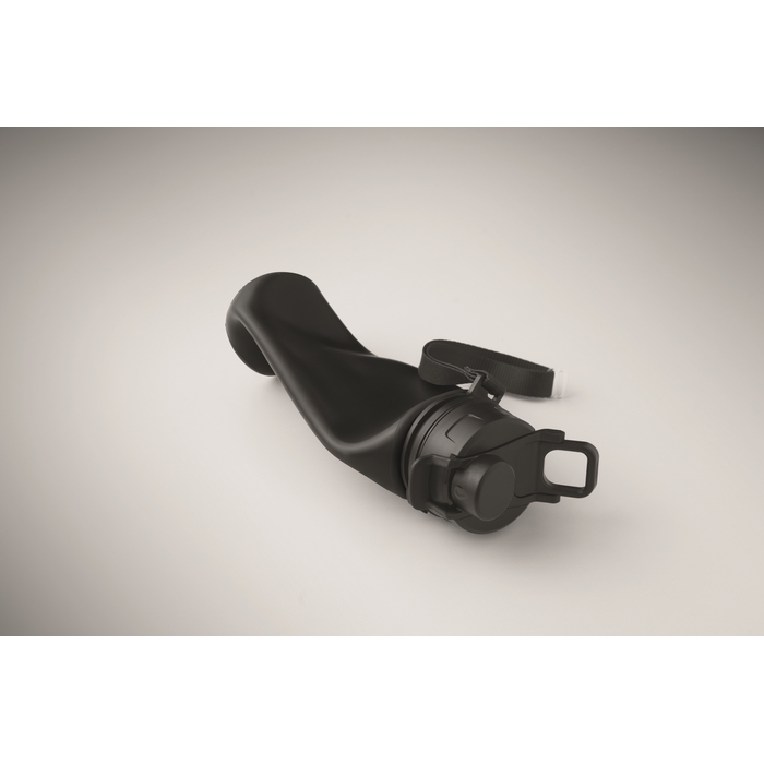 Foldable silicone sports bottle with PP lid, handle, polyester strap, and transparent buckle to secure when folded. Leak-free. Capacity: 500 ml. Rozměry: O6.7 x 24 cm