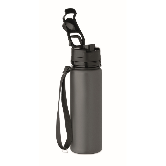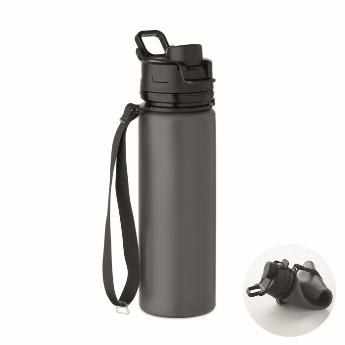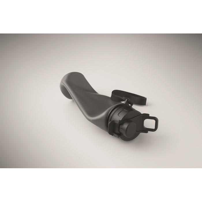 Foldable silicone sports bottle with PP lid, handle, polyester strap, and transparent buckle to secure when folded. Leak-free. Capacity: 500 ml. Rozměry: O6.7 x 24 cm