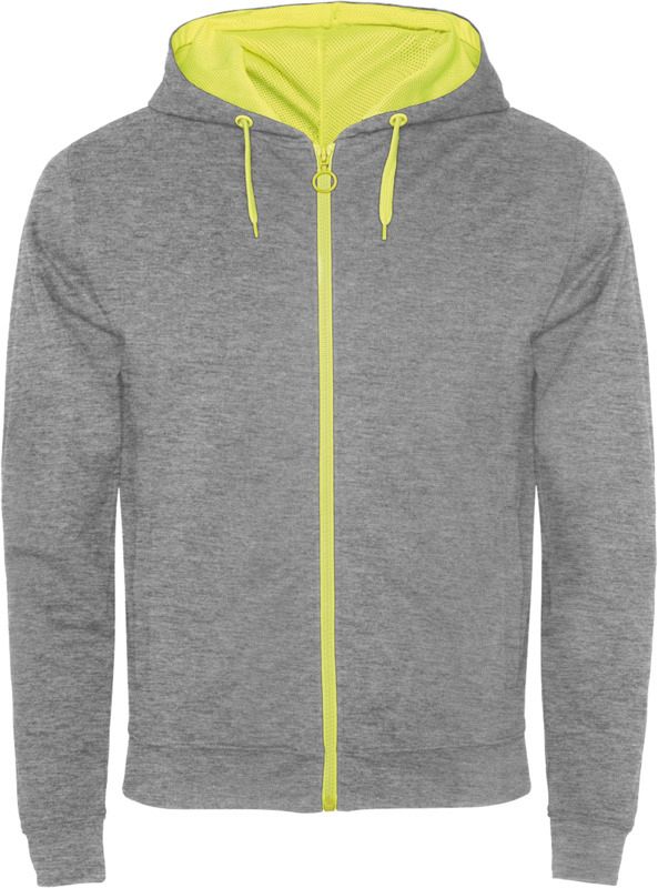 Sweat jacket in non-brushed fleece with details in fluor colour. Central zip with contrasting puller. Hood with lining in microperforated polyester fabric and contrasting fluor colour. Drawcord and metal eyelets in contrasting fluor colour. 1x1 rib in cuffs and waist. Two front pockets with wide trim. Reinforced covered seams on inner collar. Removable label. 60% Cotton and 40% Polyester, 280 g/m2.