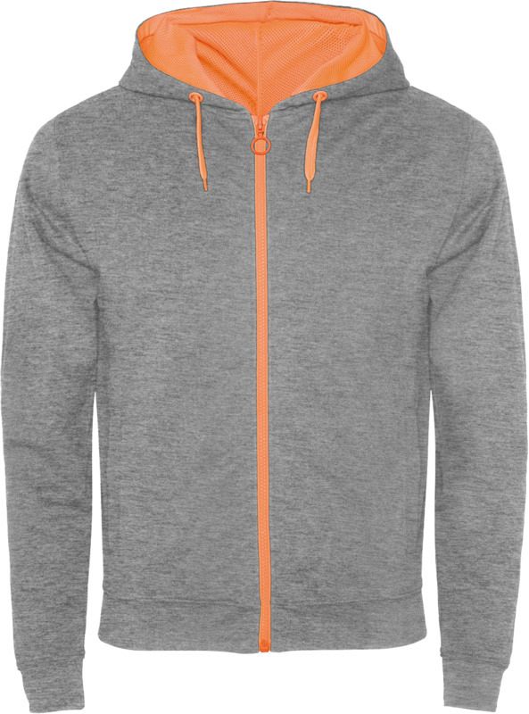Sweat jacket in non-brushed fleece with details in fluor colour. Central zip with contrasting puller. Hood with lining in microperforated polyester fabric and contrasting fluor colour. Drawcord and metal eyelets in contrasting fluor colour. 1x1 rib in cuffs and waist. Two front pockets with wide trim. Reinforced covered seams on inner collar. Removable label. 60% Cotton and 40% Polyester, 280 g/m2.