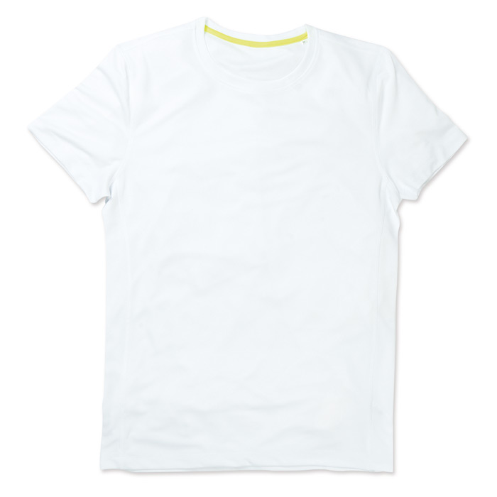 Crew neck T-shirt for men, regular fit, side panels, set-in sleeves, stretchy fabric, decorative flatlock seams, contrast neck tape in cyber yellow, small size label in teh collar, care label in the side seam. Material: 100% Active-Dry polyester bird-eyelet mesh, 140 gsm. Sizes: S-M-L-XL-XXL.