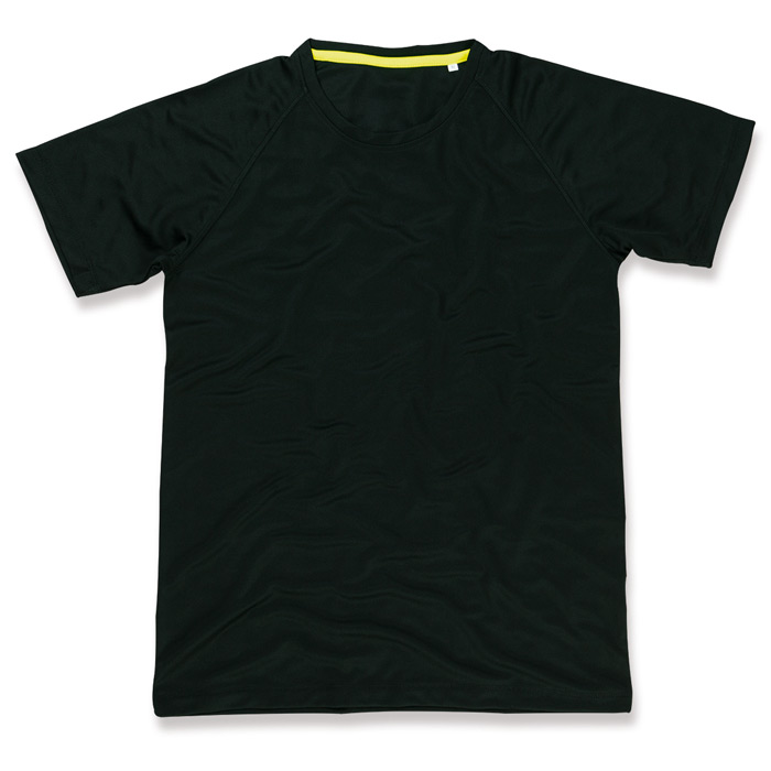Crew neck T-shirt for men, regular fit, side seams, raglan sleeves, stretchy fabric, decorative flatlock seams, contrast neck tape in cyber yellow, small size label in teh collar, care label in the side seam. Material: 100% Active-Dry polyester bird-eyelet mesh, 140 gsm. Sizes: S-M-L-XL-XXL.