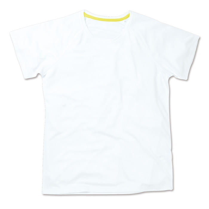 Crew neck T-shirt for women, regular fit, side seams, raglan sleeves, stretchy fabric, decorative flatlock seams, contrast neck tape in cyber yellow, small size label in teh collar, care label in the side seam. Material: 100% Active-Dry polyester bird-eyelet mesh, 140 gsm. Sizes: S-M-L-XL.