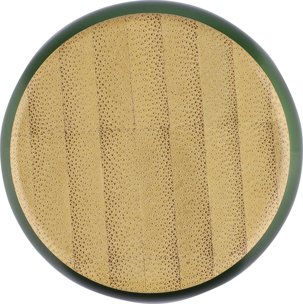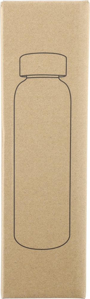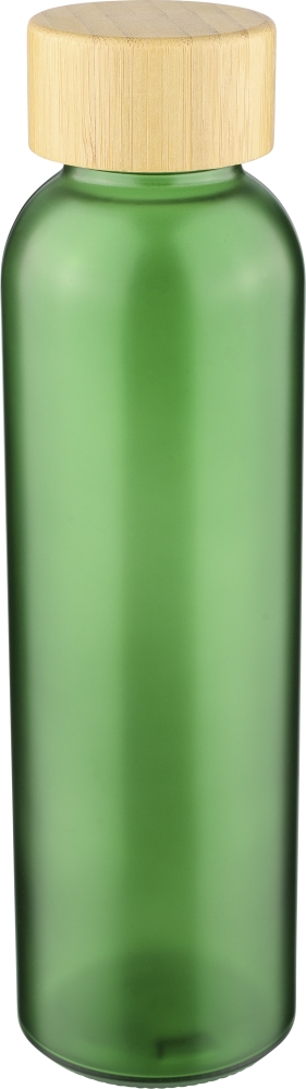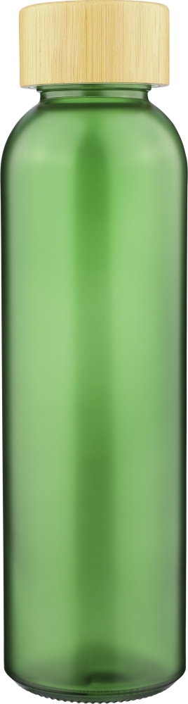 Glass drinking bottle (500 ml) with a frosted coated body and bamboo screw lid with PP inner core. Made from sodium calcium glass, suitable for cold drinks only. Individually packaged in a brown cardboard box. Dimensions: 6,3 cm x 23 cm