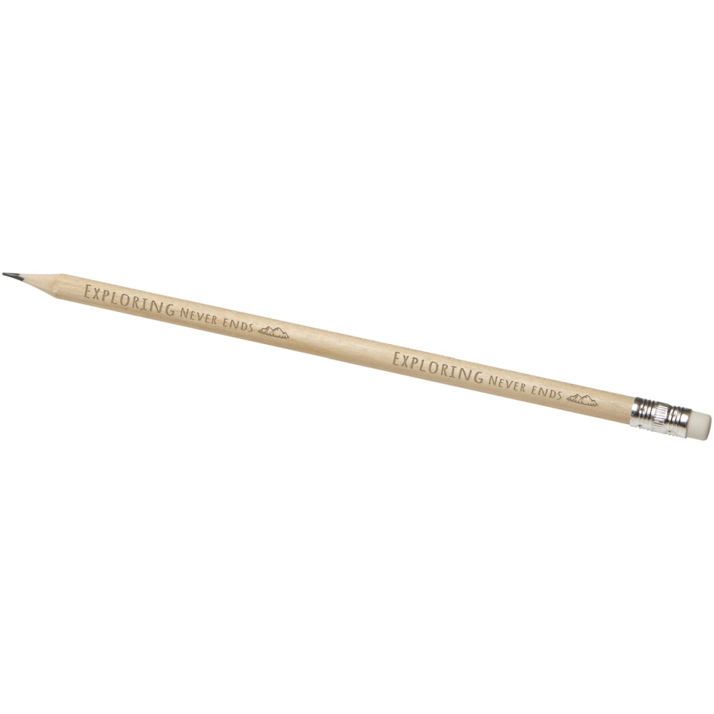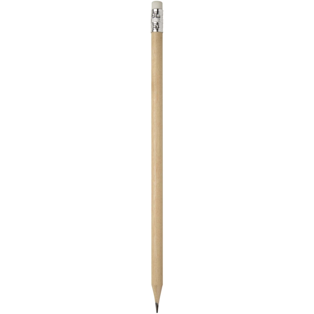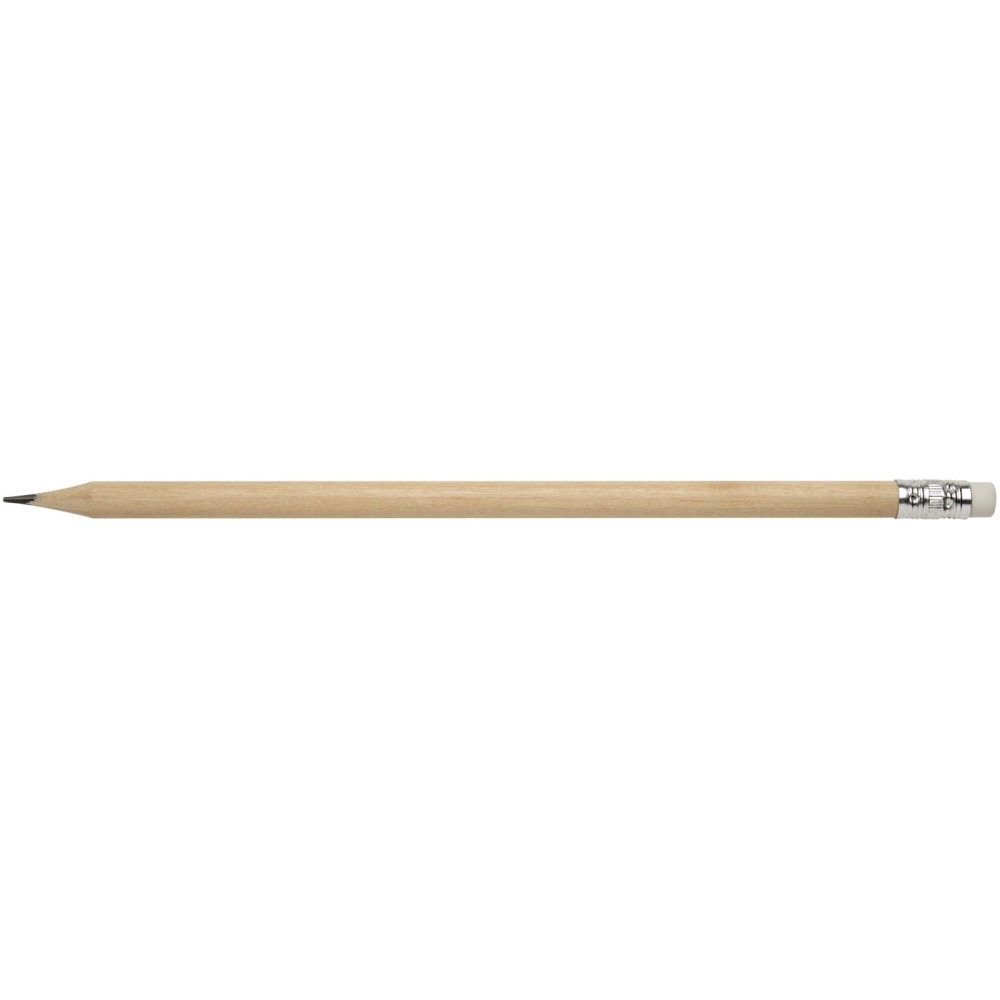 Pencil with eraser. The pencil is made of poplar wood and graphite, the eraser is made of plastic, and the ferrule is made of aluminium. Dimensions: 19 x O 7 cm