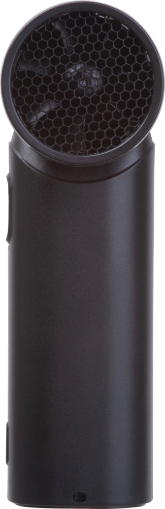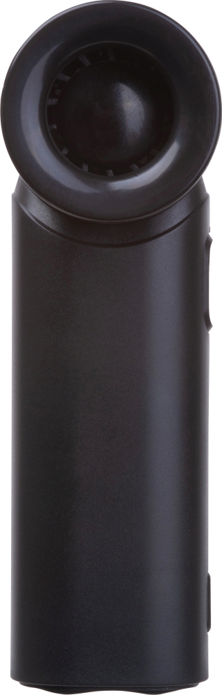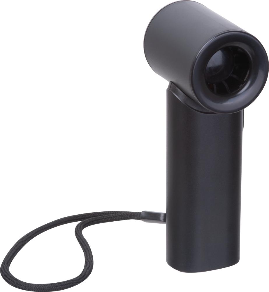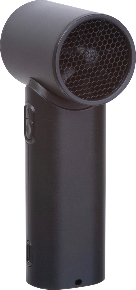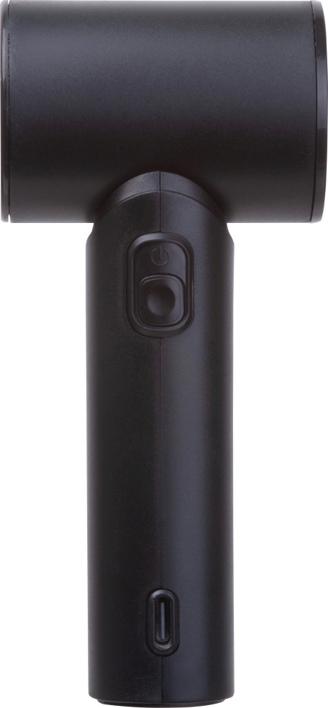 Compact handheld fan with five adjustable speed settings. 5W power and a rechargeable battery lasting up to 3–4 hours (on level one), comes with charging cable: Type C connection (USB to USB-C cable). Battery capacity: 1800mAh. Dimensions: 3,7 x 5,3 x 11,5 cm