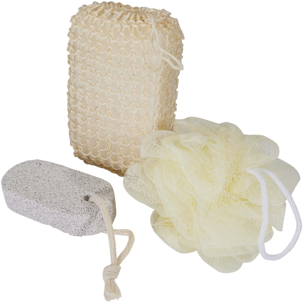 3-piece bath accessories set including a bath ball/luffa, a pumice stone, and a sisal hemp sponge. Size bath ball/luffa: 9cm. Size pumice stone: 9.5 x 4.5 x 1.5 cm. Size hemp sponge: 14 x 8 x 5 cm. Packaged in a polyester pouch. Dimensions: 22 x 19,5 cm