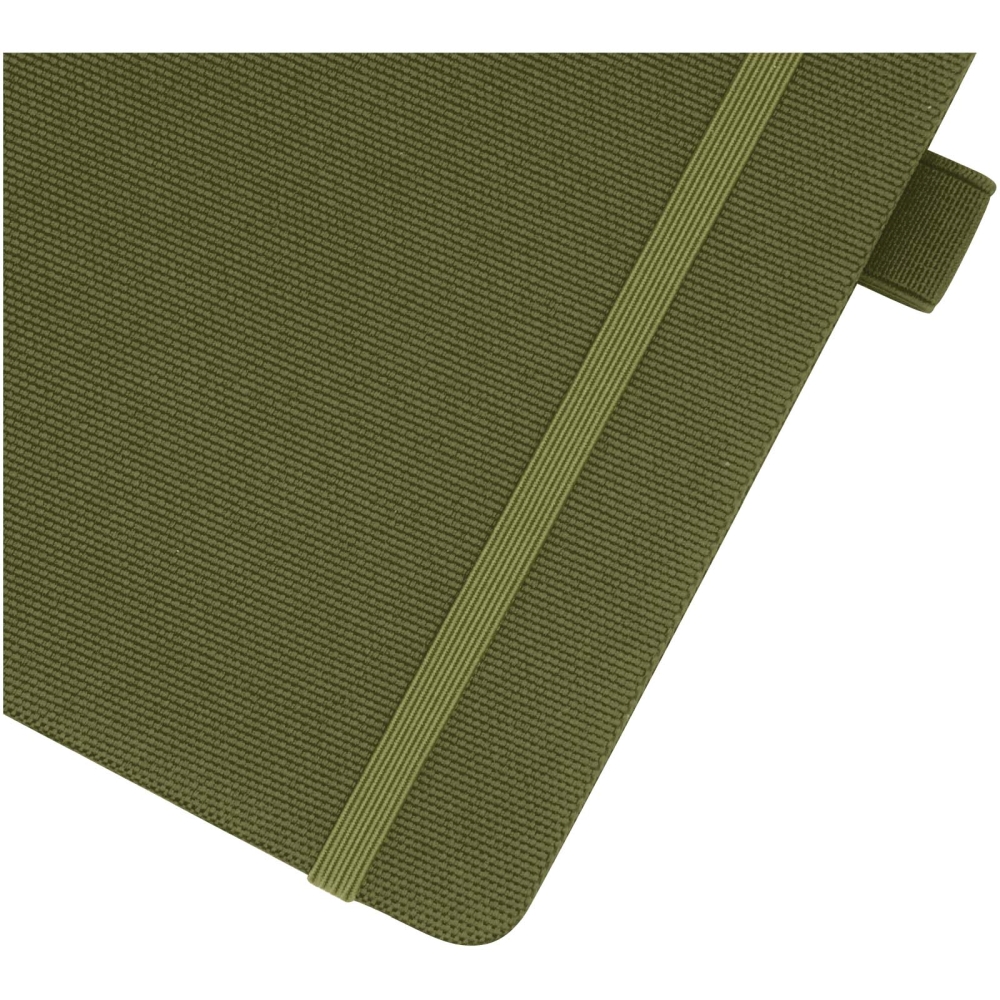 A5 notebook with cover made of RPET fabric. Features 80 sheets 70 g/m2 recycled paper with lined layout, a pen loop, and ribbon marker. Dimensions: 21,5 x 14,5 cm