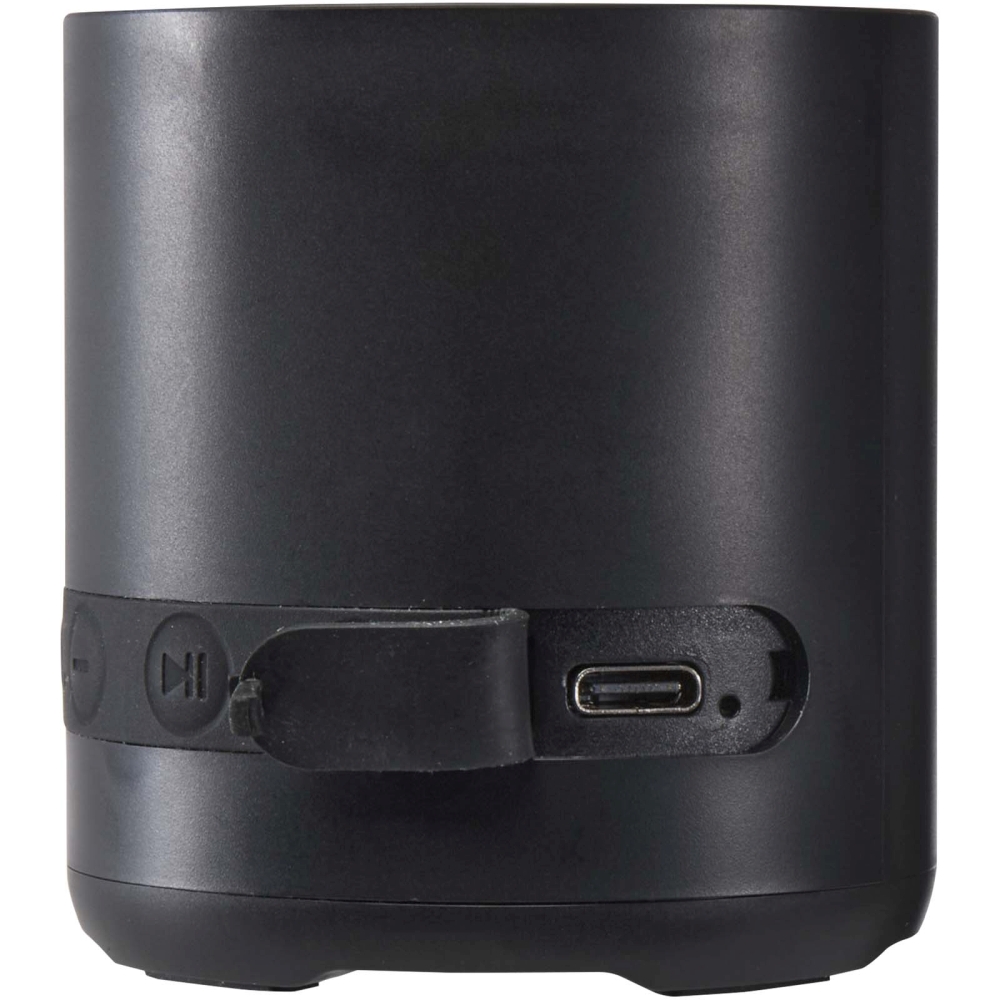 The Hunor 3W wireless Bluetooth® speaker is made from recycled plastic, and features a Type-C charging port, volume controls, a Play/Pause/Call button, and a built-in microphone. Thanks to the TWS (True Wireless Stereo) functionality, you can pair two speakers for a stereo sound experience. Dimensions: 6 x 6,8 cm