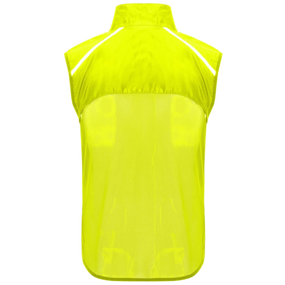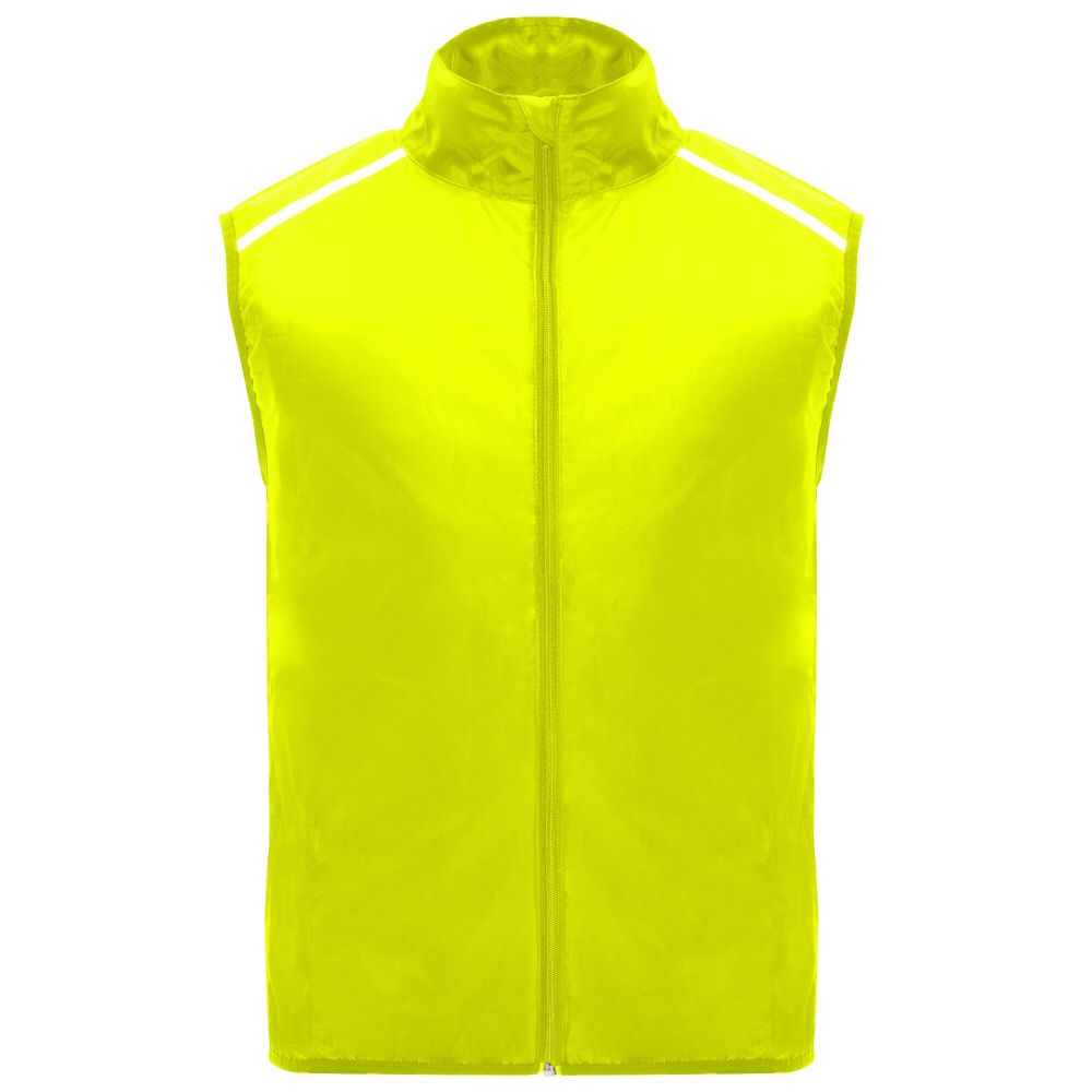 Wind-proof and breathable. Front zip with matching chin protector. Elastic binding at armhole and bottom. Bottom part of the back in microperforated fabric. High-visibility details on the top, front and back. Pocket with elastic strap to stow the vest and wear it on the wrist. Removable label. 100% Polyester, 70 g/m2, Contrast fabric, Mesh with cool fit finish of 100% Polyester, 70 g/m2.
