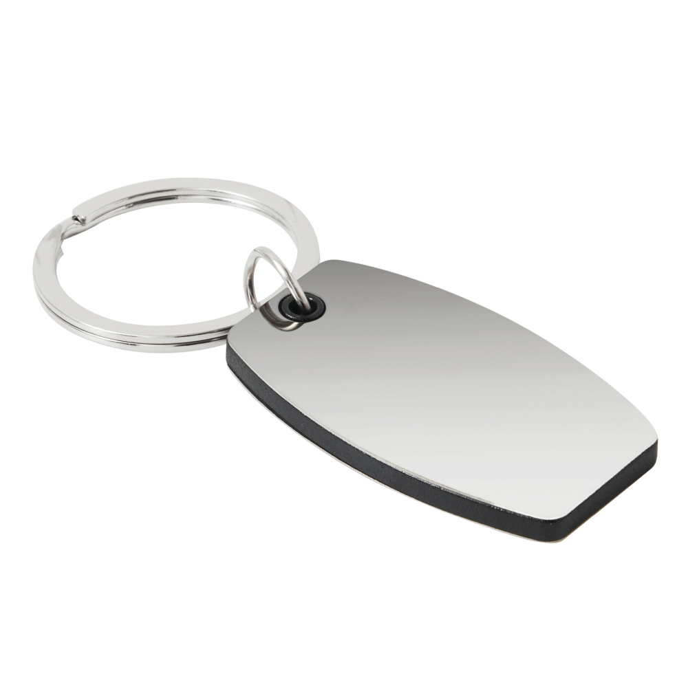 Key ring: coloured plastic piece between high gloss polished steel. Dimensions: 5 x 3 x 0,4 cm