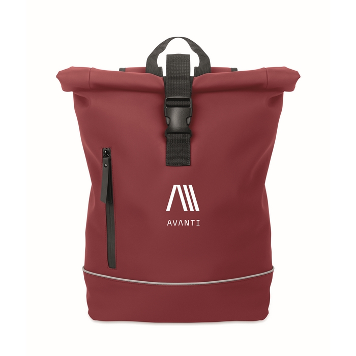 15 inch roll top laptop backpack in soft PU with padded back and base reinforcement with reflective strip. Waterproof zippered front pocket. 210D RPET polyester lining. Dimensions: 40 x 12 x 54 cm