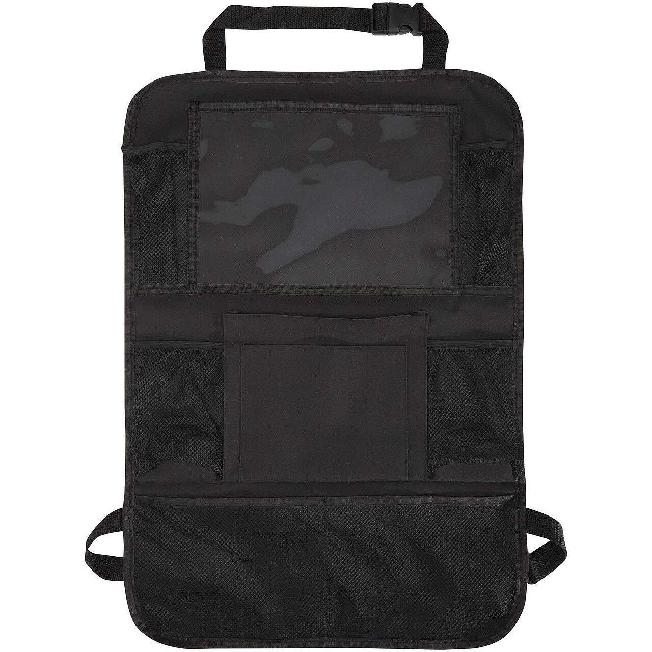 Car back seat organiser with multiple mesh pockets to hold essentials such as snacks, toys, or bottles, plus a PVC window for a tablet. It attaches easily to the front seat and helps keep your car tidy and clutter-free – ideal for families, road trips, or everyday use. Dimensions: 0,5 x 60 x 40 cm