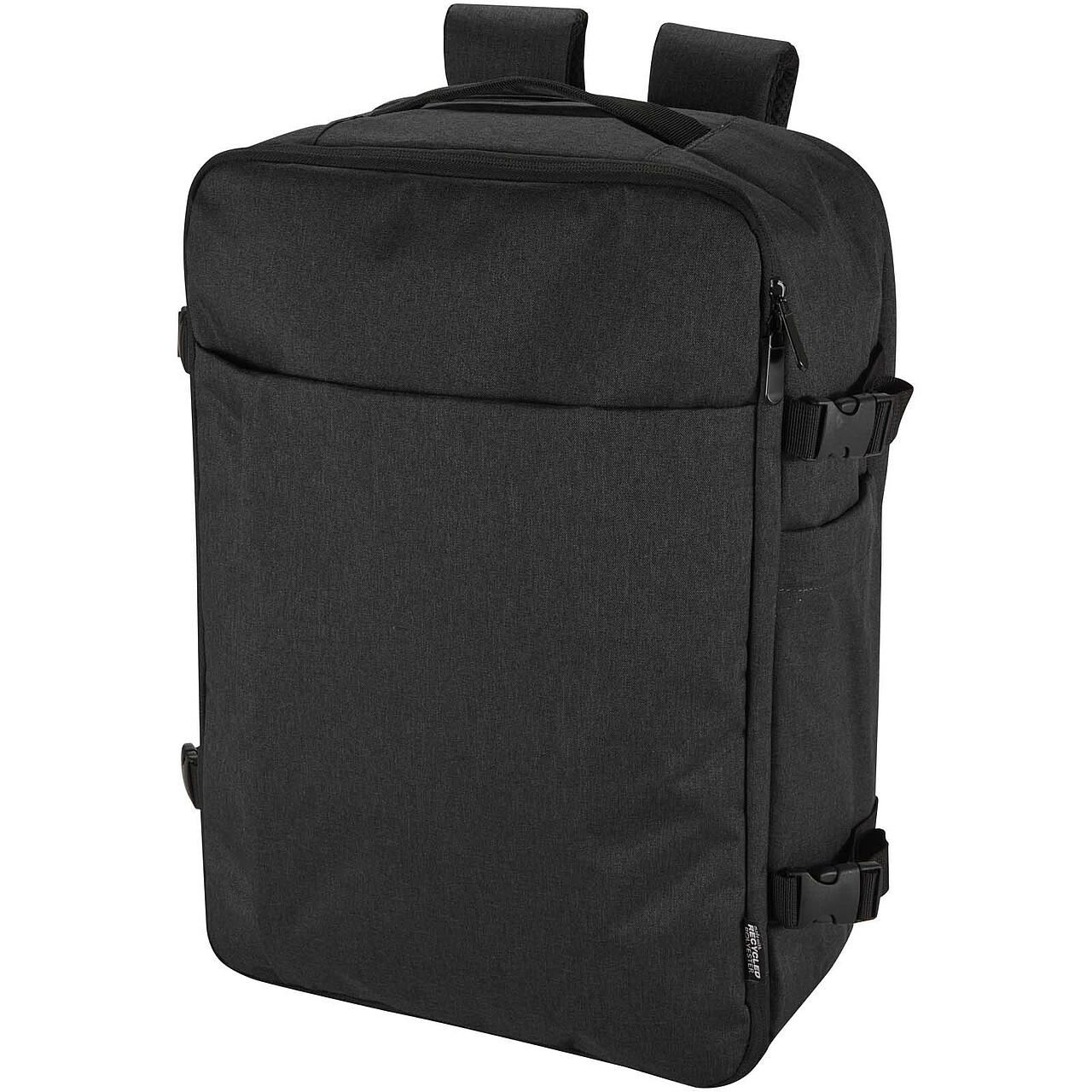 Made from GRS certified recycled polyester with an RPET lining, the Libra 17" carry-on backpack is designed to comply with airline cabin luggage requirements, making it an ideal travel companion. It includes a dedicated laptop compartment for devices up to 17", a spacious main section with elastic straps and mesh dividers to keep belongings secure and organised, and two large front zippered pockets for easy access to essentials. For comfort and convenience, the backpack features a breathable back panel, a trolley strap, adjustable shoulder straps with a cross-chest strap, and both top and side handles for versatile carrying options. Suitable for business trips, remote work, or weekend travel, this backpack combines a sleek design with practical functionality for life on the move. Dimensions: 31,5 x 45 x 17 cm
