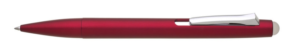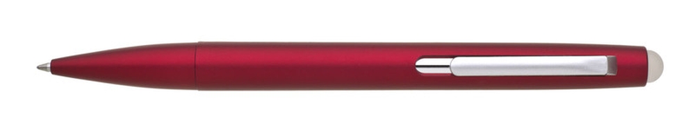 Rubberized plastic ballpoint pen in solid red color with silver clip and tip for erasing written text. Blue refill, rubberized.
