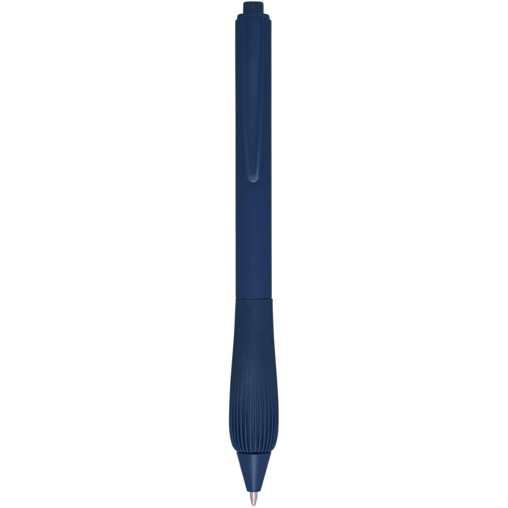 Recycled plastic ballpoint pen with a rubberized barrel, and grip made of TPR. Ink colour: Blue. Writing length: 1000 metres. Nib size: 1.0 mm. Dimensions: 14,3 x O 1,02 cm