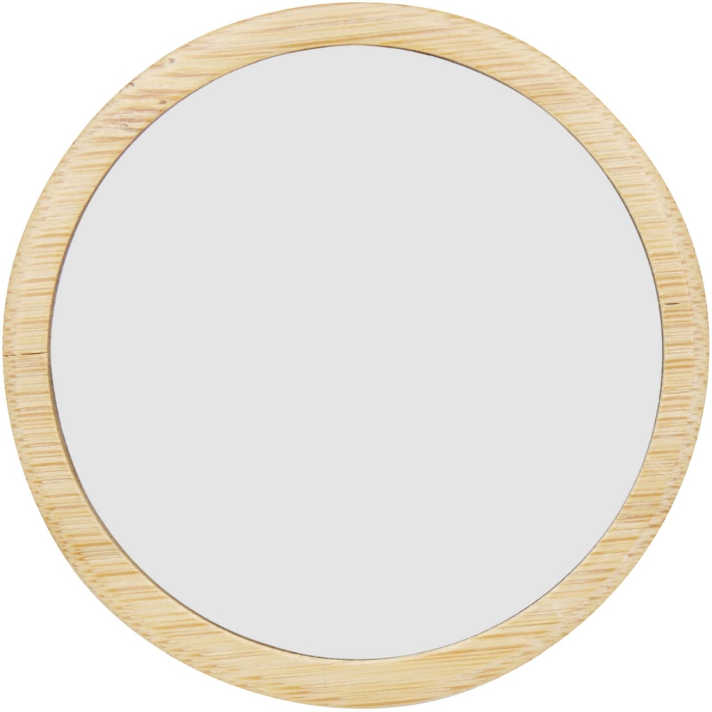 Round mirror made from bamboo for a natural and elegant touch. Delivered in a cotton pouch. Dimensions: 6,9 x 6,9 cm