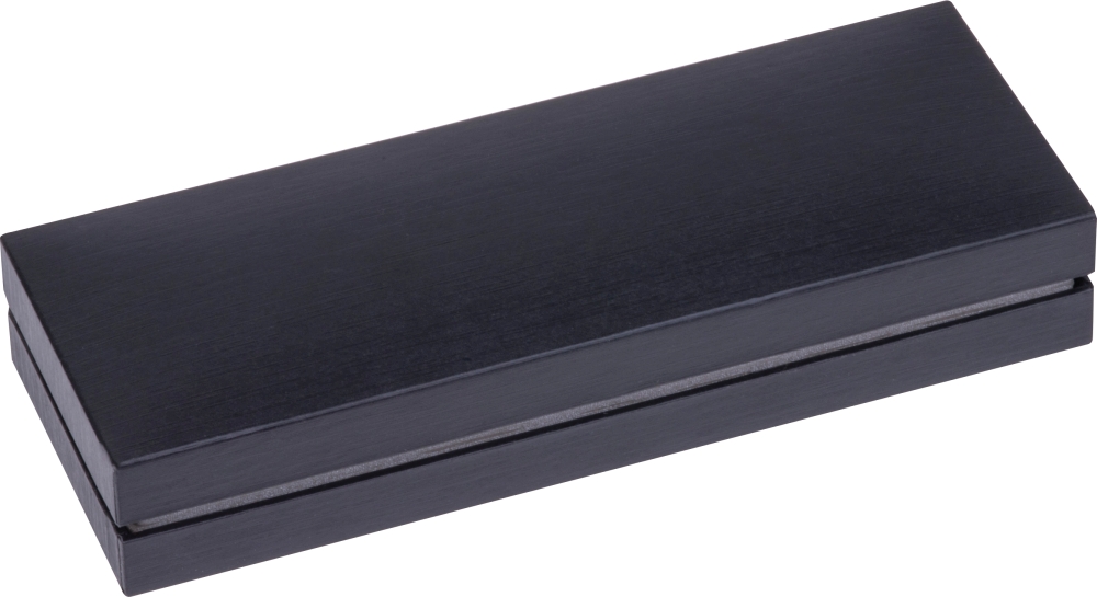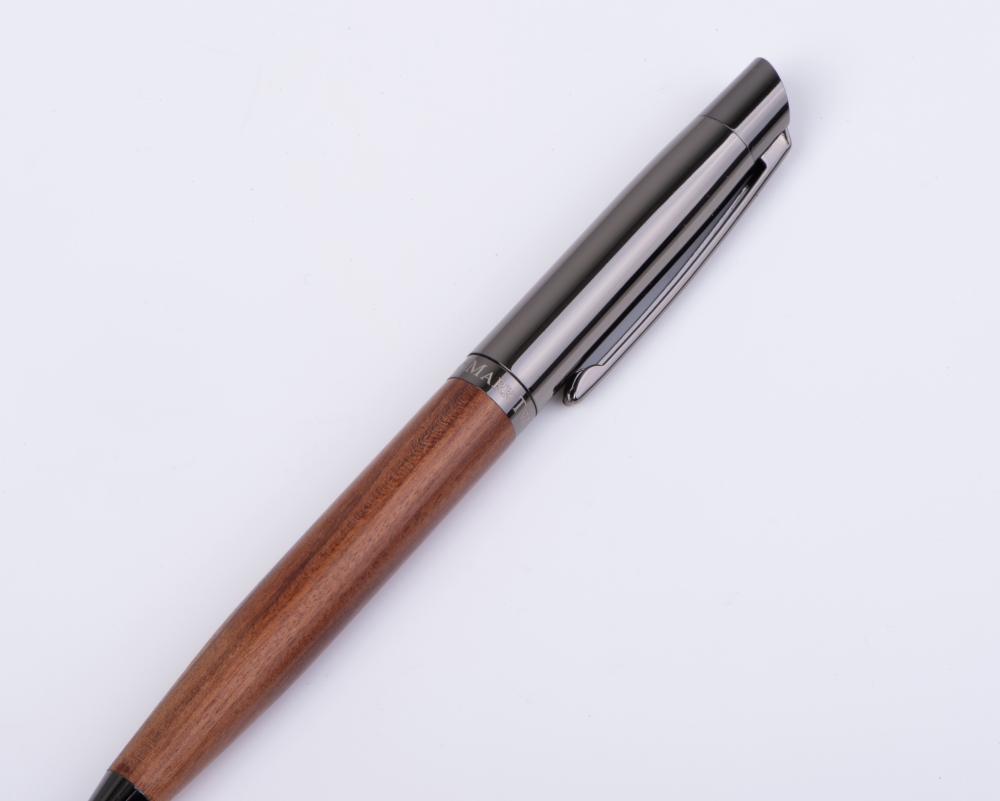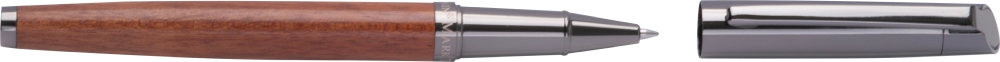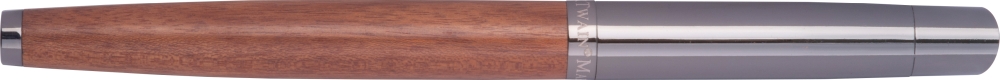Mark Twain writing set made of stainless steel and wood. Ballpoint pen writes in blue, 1200 m writing length; rollerball writes in blue, 400 m writing length. Dimensions: 17,2 x 6,4 x 3 cm