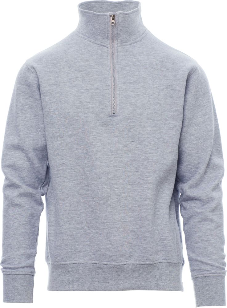 Men’s sweatshirt with matching half zip in plastic with metal pull, fitted sleeves, stretch rib cuffs and hem, reinforced seams. 70 % cotton a 30 % polyester, 280 gsm.