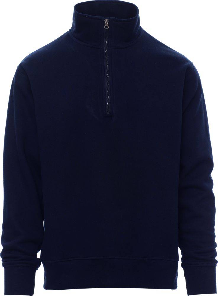 Men’s sweatshirt with matching half zip in plastic with metal pull, fitted sleeves, stretch rib cuffs and hem, reinforced seams. 70 % cotton a 30 % polyester, 280 gsm.