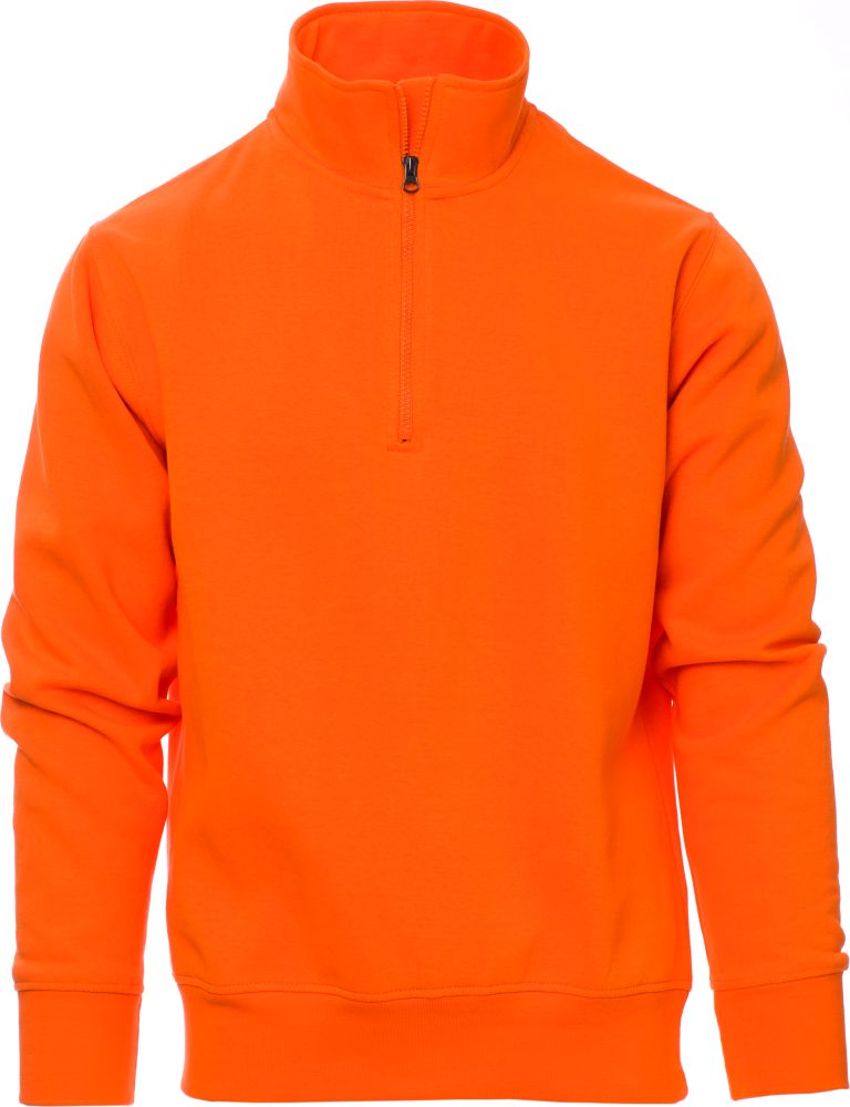 Men’s sweatshirt with matching half zip in plastic with metal pull, fitted sleeves, stretch rib cuffs and hem, reinforced seams. 70 % cotton a 30 % polyester, 280 gsm.