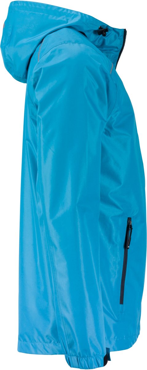 Wind and waterproof (3,000mm water column) with TPU-coating, breathable (1,500g/m2 in 24h), adjustable hood with elastic cord, chin guard, 2 side pockets with zip, inner pocket, sealed seams, zips in contrasting color, decoration access at the back, reflective details (without protective function) on hood, front and back Outside: 100% polyester, inside: 100% polyester