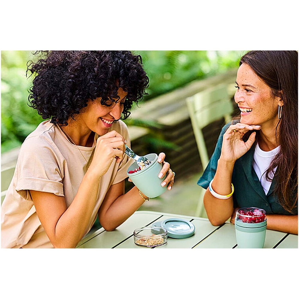 The Ellipse Mini lunch pot is perfect for a variety of snacks, such as yogurt with muesli or soup with croutons. Featuring two smart compartments in one sturdy container, it keeps your ingredients neatly separated. Its compact size makes it ideal for easily fitting into a school bag for a quick, convenient meal. The top transparent container holds 120 ml, ideal for around 50 grams of muesli or fruit, and the bottom container has a capacity of 300 ml. Leakproof and dishwasher safe. BPA free. Dimensions: 12,8 x O 9,1 cm