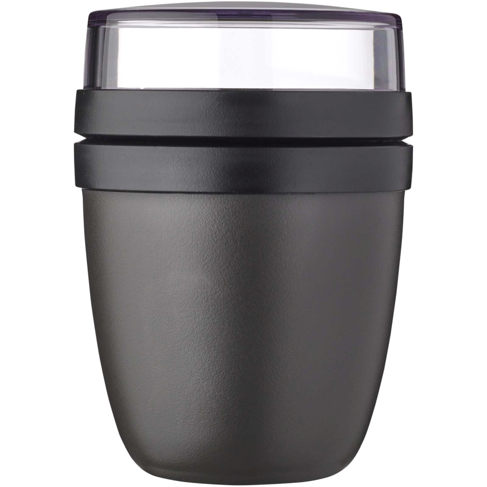 The Ellipse Mini lunch pot is perfect for a variety of snacks, such as yogurt with muesli or soup with croutons. Featuring two smart compartments in one sturdy container, it keeps your ingredients neatly separated. Its compact size makes it ideal for easily fitting into a school bag for a quick, convenient meal. The top transparent container holds 120 ml, ideal for around 50 grams of muesli or fruit, and the bottom container has a capacity of 300 ml. Leakproof and dishwasher safe. BPA free. Dimensions: 12,8 x O 9,1 cm