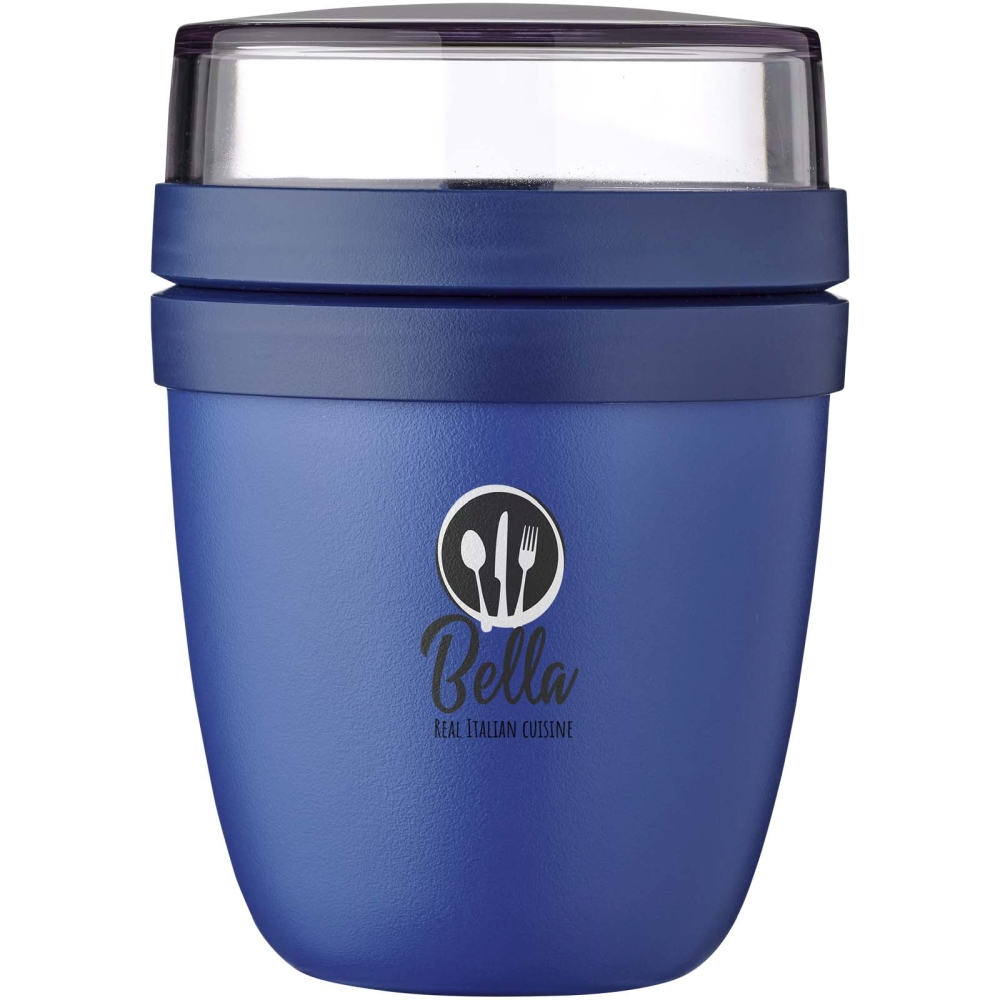 The Ellipse Mini lunch pot is perfect for a variety of snacks, such as yogurt with muesli or soup with croutons. Featuring two smart compartments in one sturdy container, it keeps your ingredients neatly separated. Its compact size makes it ideal for easily fitting into a school bag for a quick, convenient meal. The top transparent container holds 120 ml, ideal for around 50 grams of muesli or fruit, and the bottom container has a capacity of 300 ml. Leakproof and dishwasher safe. BPA free. Dimensions: 12,8 x O 9,1 cm
