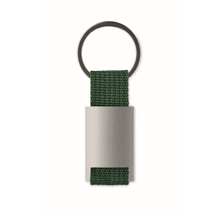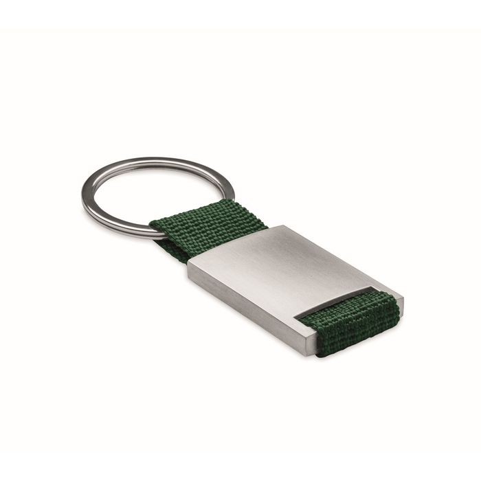 Metal rectangular key ring with coloured polyester webbing. Individually packed in a carton gift box. Dimensions: 9 x 3,5 x 0,8 cm